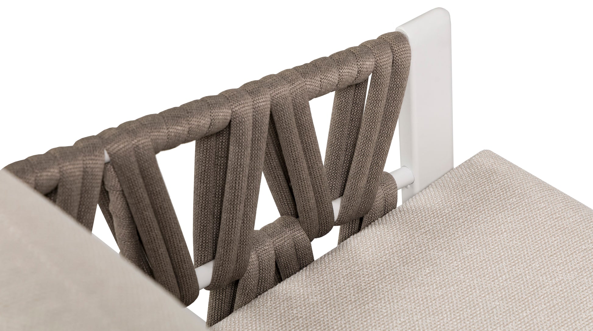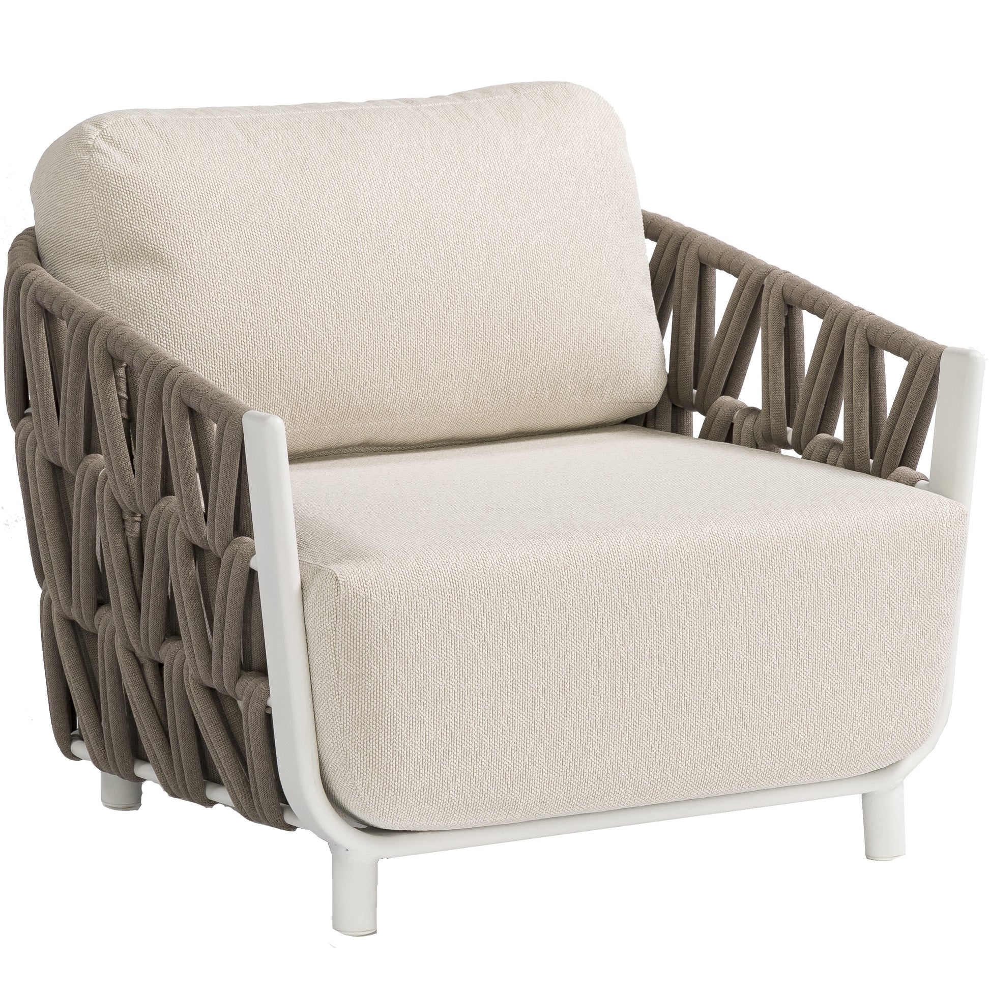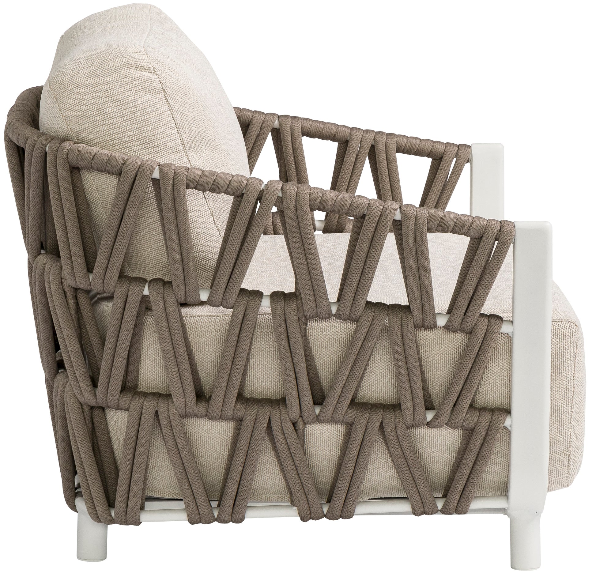 Butaca 1 plaza Carson. Estructura en aluminio blanco combinado con cuerda náutica de 19 mm color greige. Cojín de asiento (30 cm) y respaldo (15 cm) color beige con tratamiento waterproof..