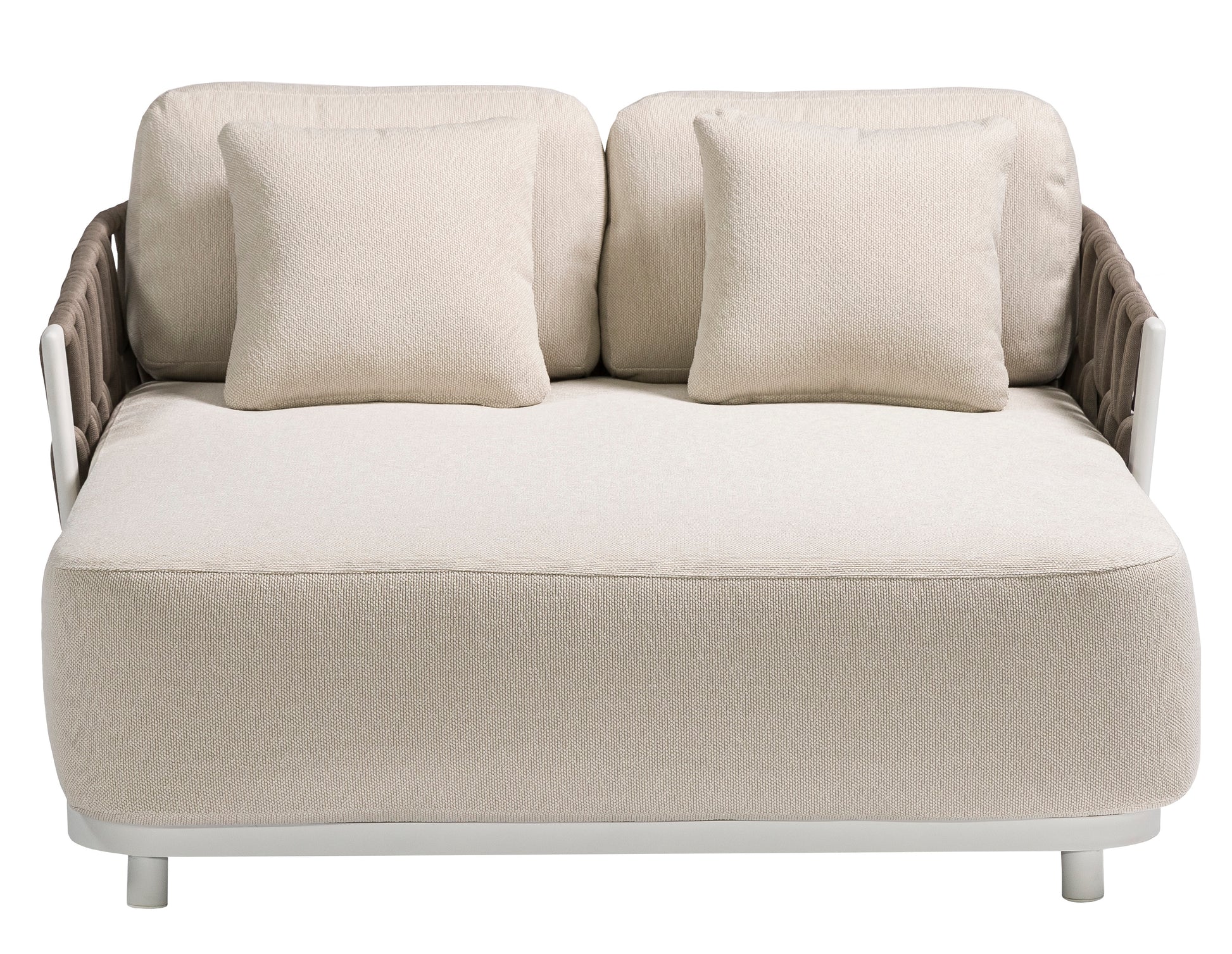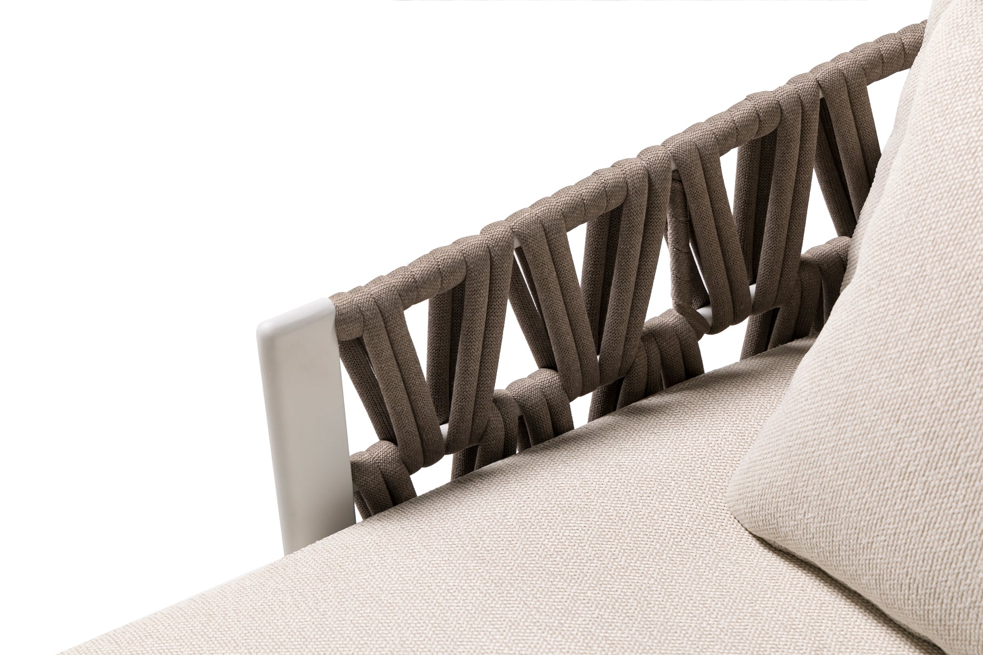 Daybed Carson. Estructura en aluminio blanco combinado con cuerda náutica de 19mm color greige. Cojín de asiento (30 cm) y respaldo (15 cm) color beige con tratamiento waterproof..