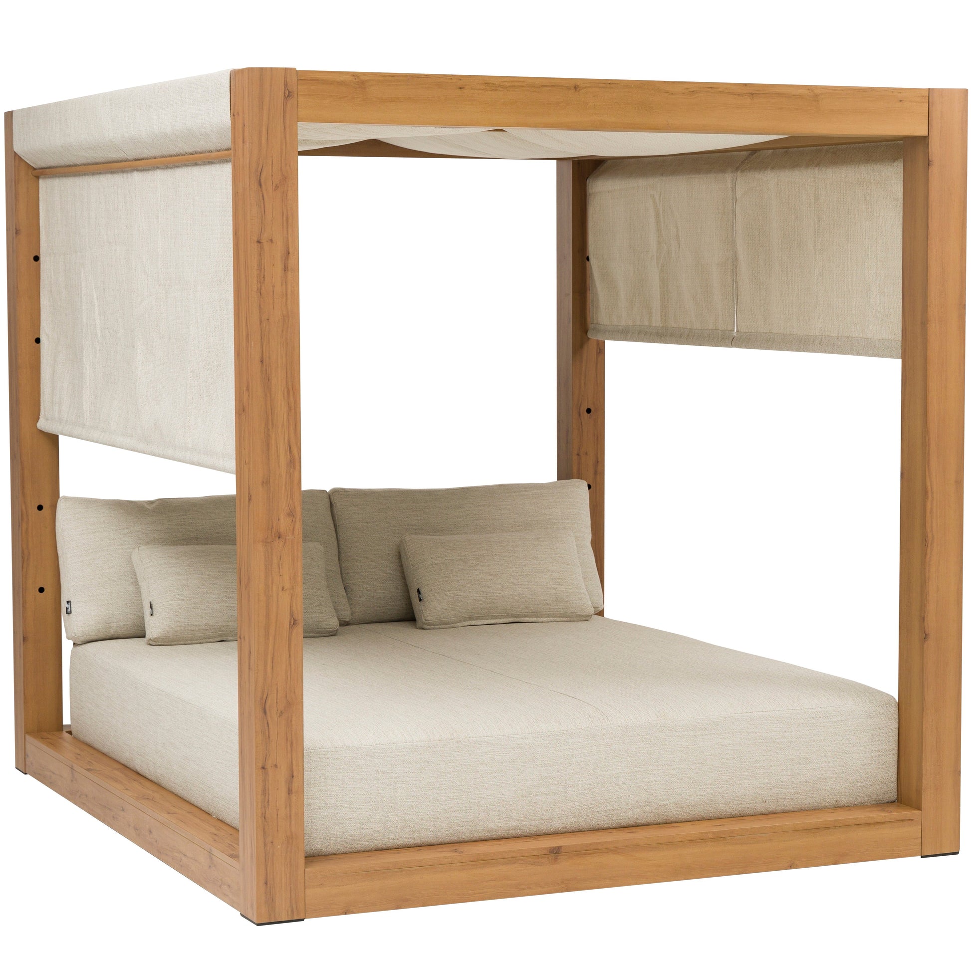 Daybed Java 220x196x200 cm. Estructura de aluminio con recubrimiento por transferencia térmica en efecto teca natural, de alta durabilidad. Incluye colchón de 30 cm y respaldos de 25 cm en tejido in & out color beige, más dos cojines auxiliares. Incorpora cortinas laterales desplazables. Requiere montaje..