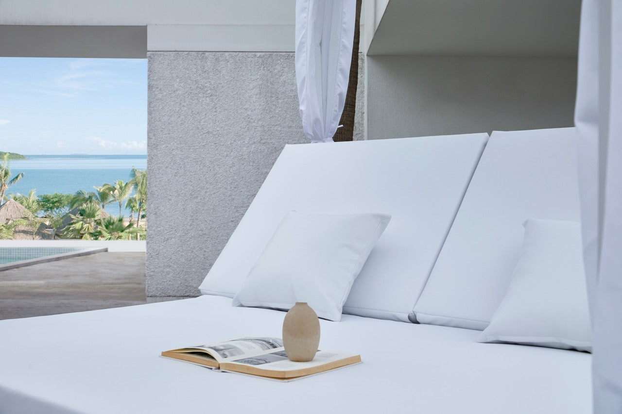 Daybed Mabie. Estructura en aluminio lacado en blanco. Cortinas y cubierta en olefina blanca. Colchon de 12cm confeccionado en tejido nautico blanco. Cubierta desplazable. 2 respaldos multiposicion independientes..