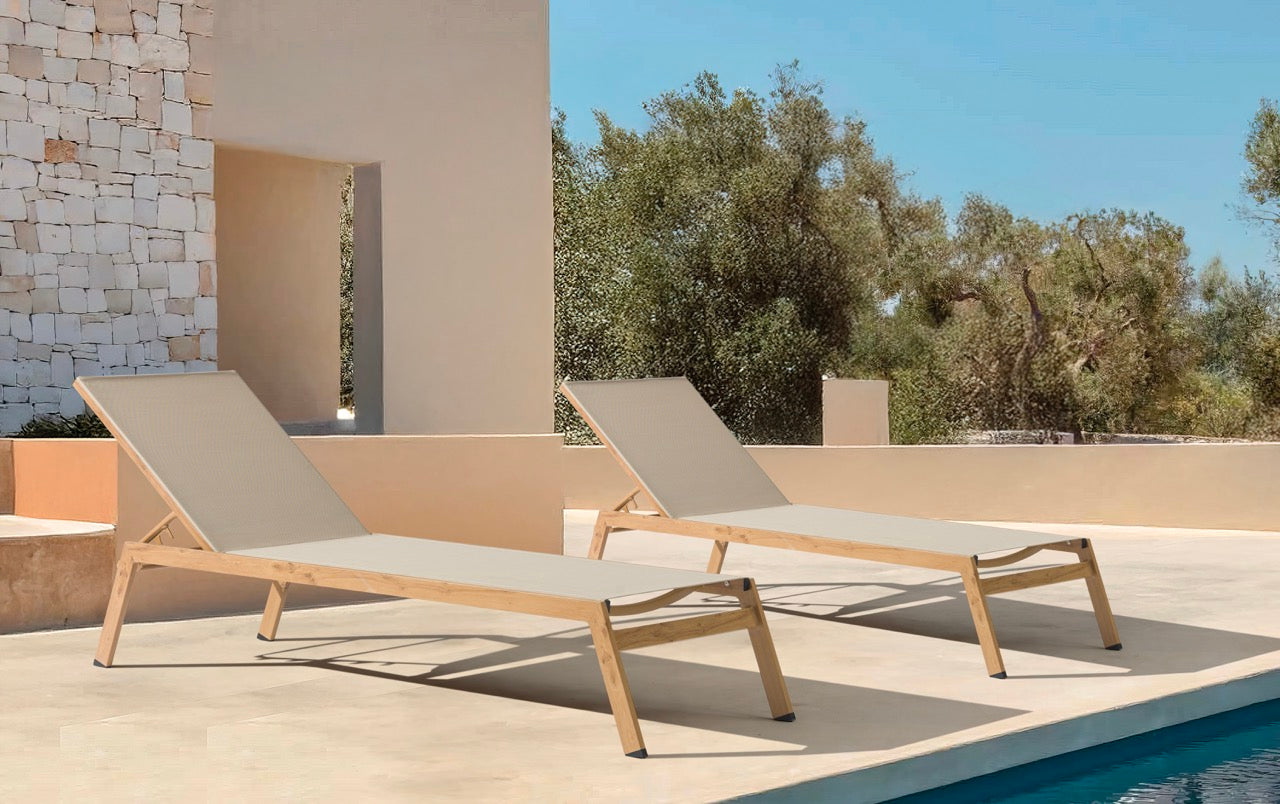 Hamaca apilable Java 205x65x35 cm. Estructura en aluminio recubierto por transferencia térmica efecto teca natural de alta durabilidad combinado con textilene color taupe. Respaldo multiposición..