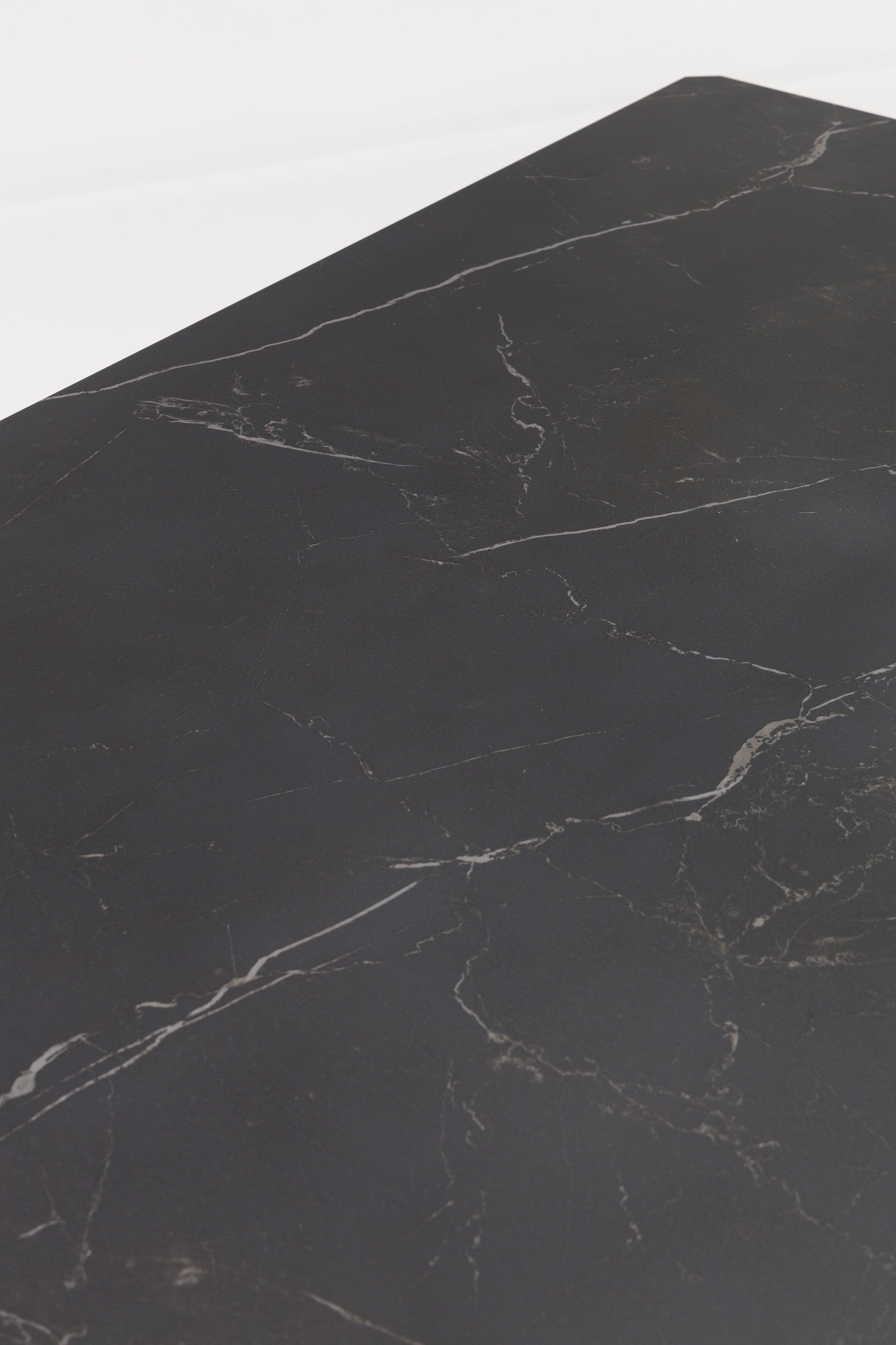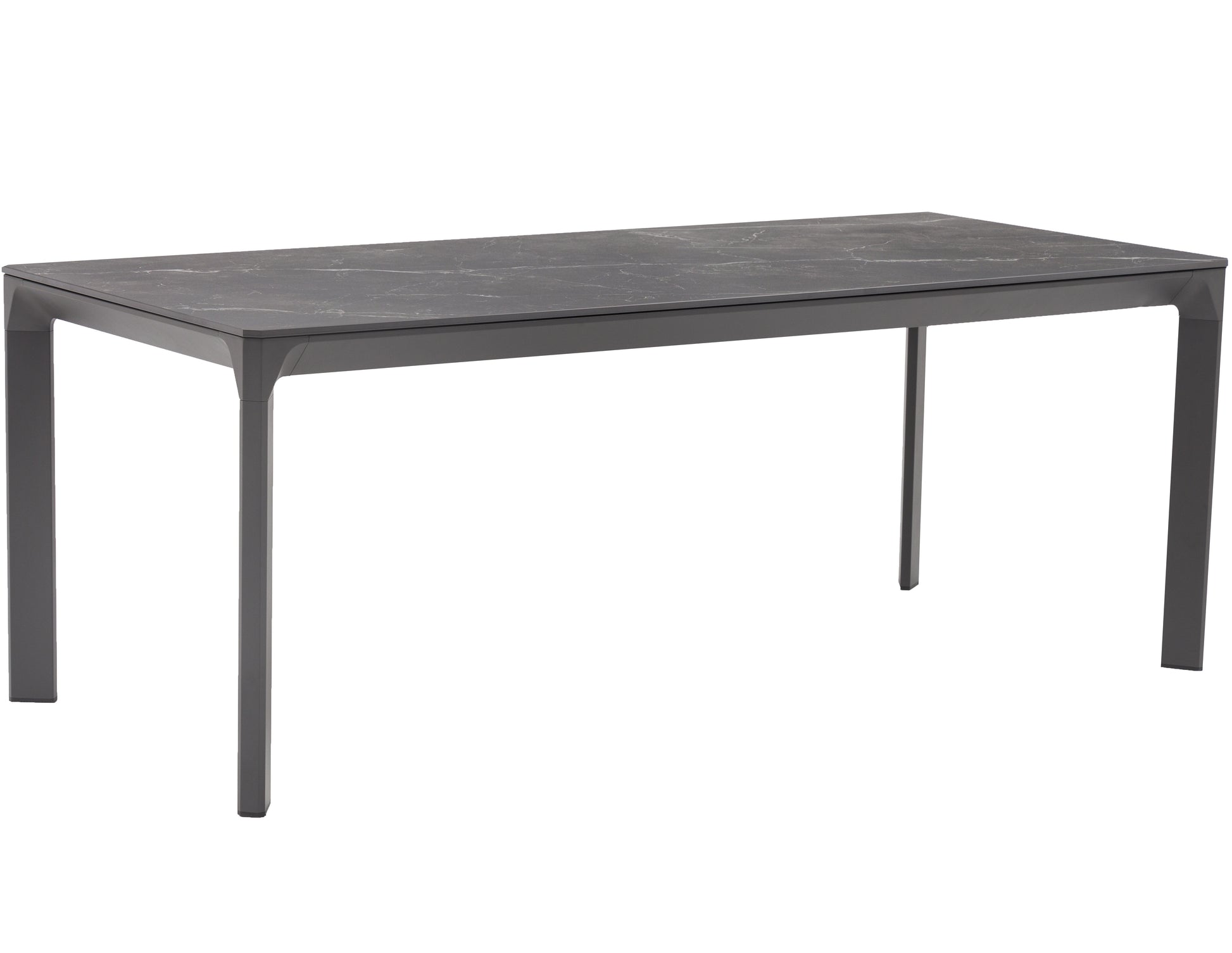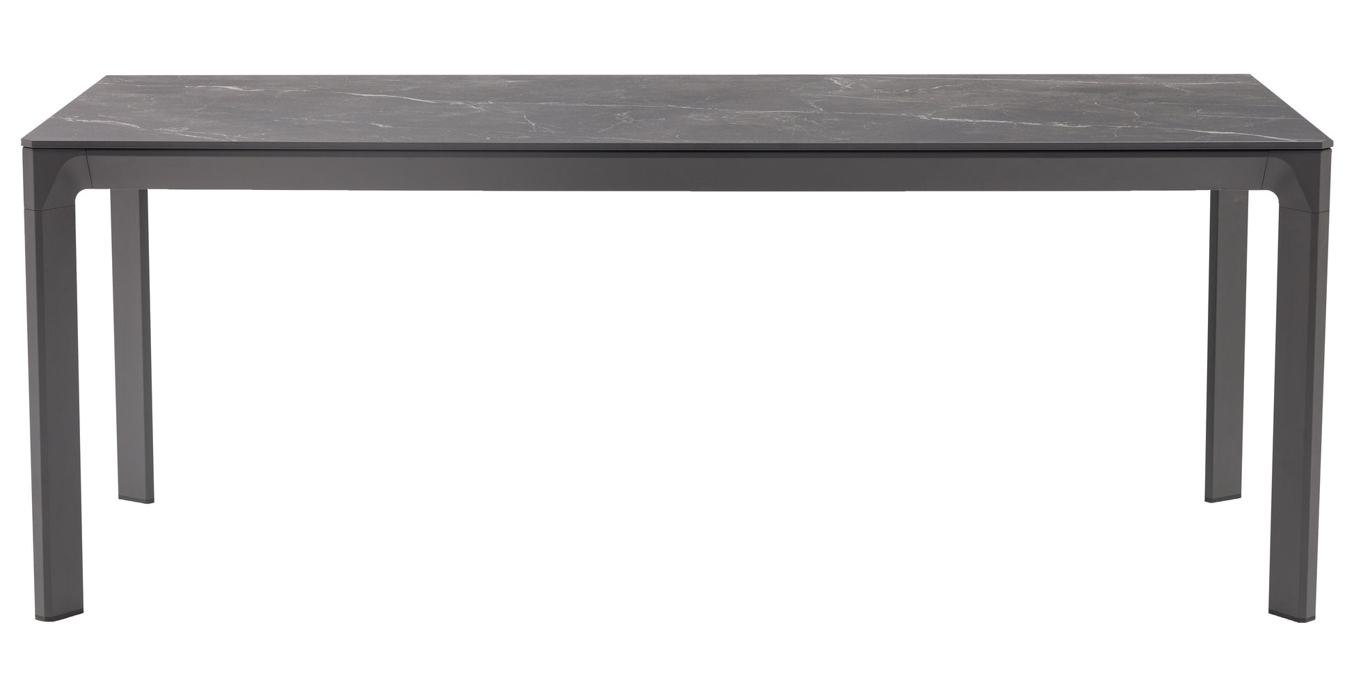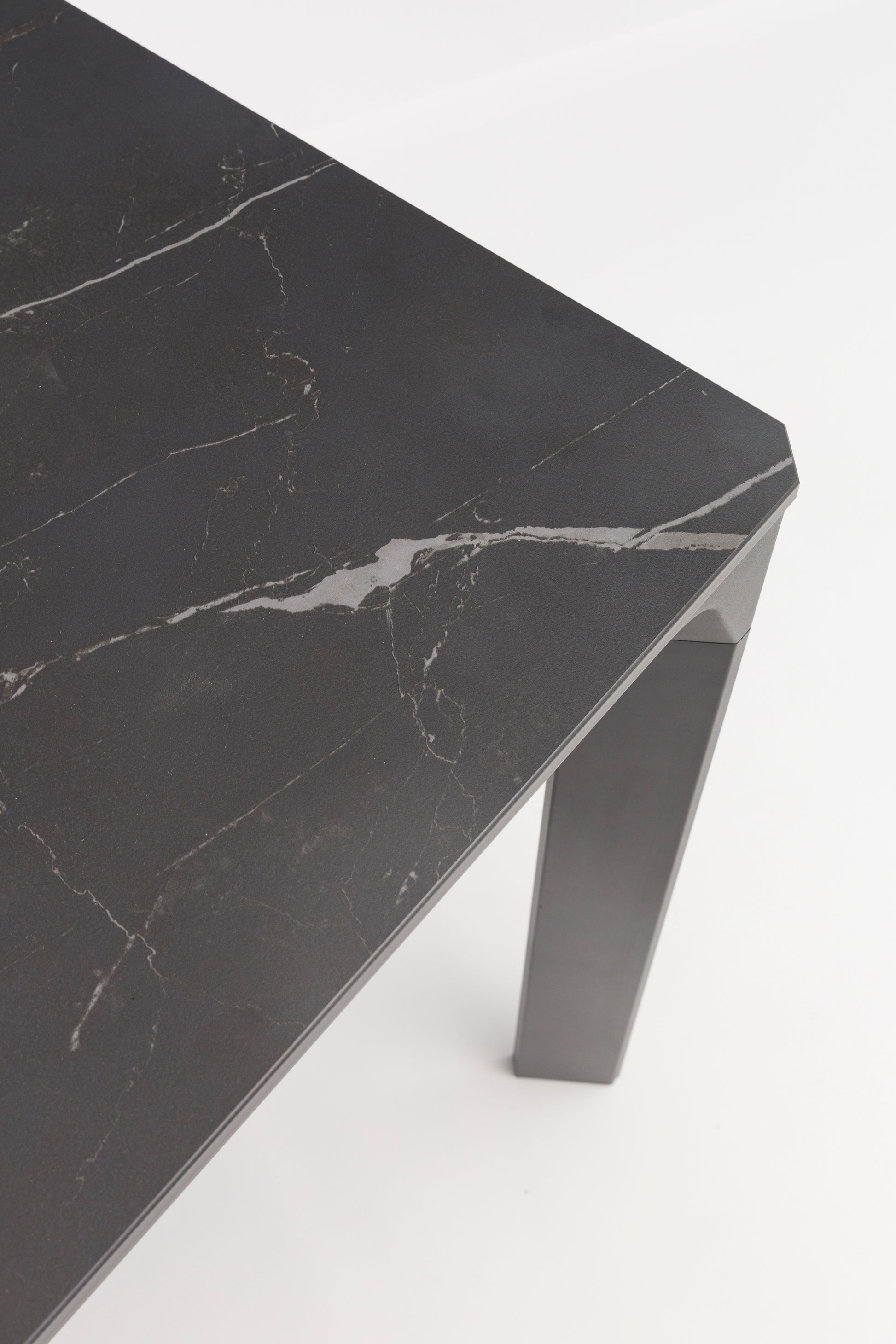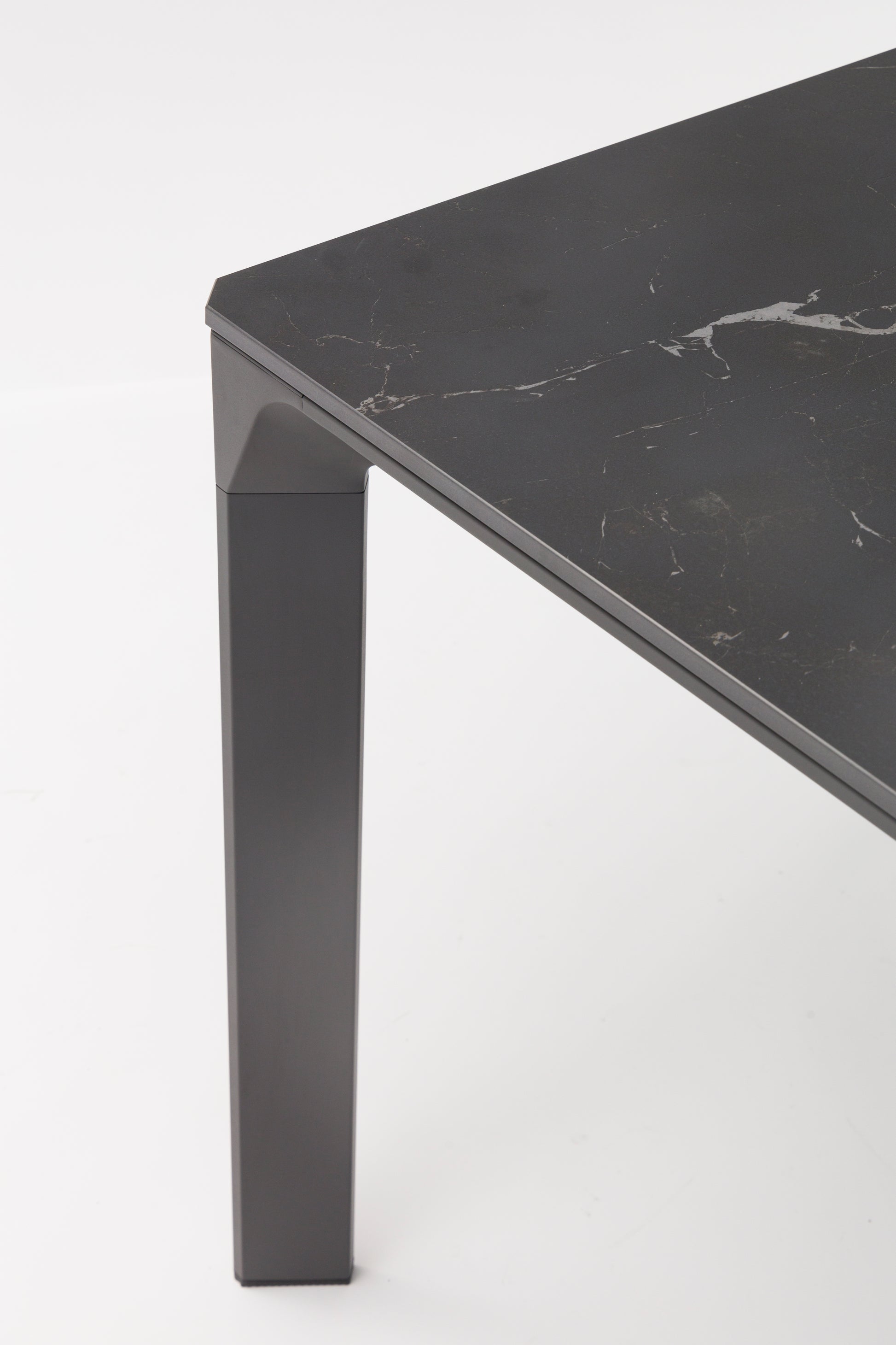 El top de piedra sinterizada con efecto mármol negro es el alma de esta mesa. Este material de alta tecnología ofrece la estética del mármol natural con una resistencia excepcional a manchas, rayones, altas temperaturas y condiciones climáticas extremas. Con un grosor de 1,2 cm, la encimera es robusta y visualmente impactante.