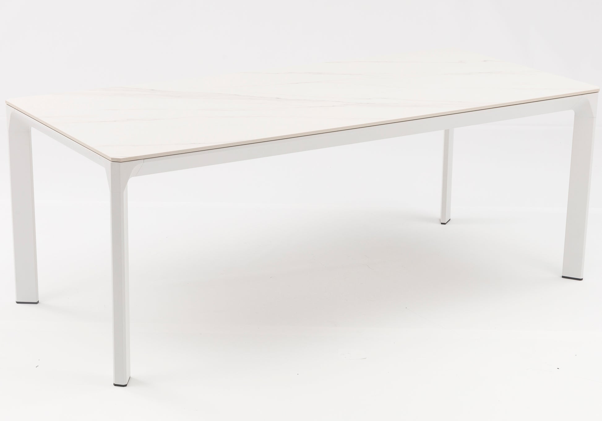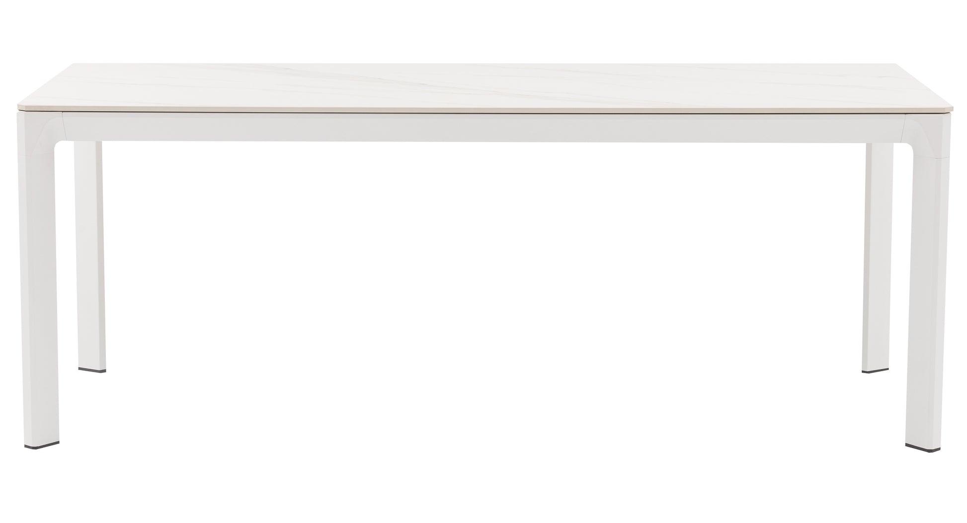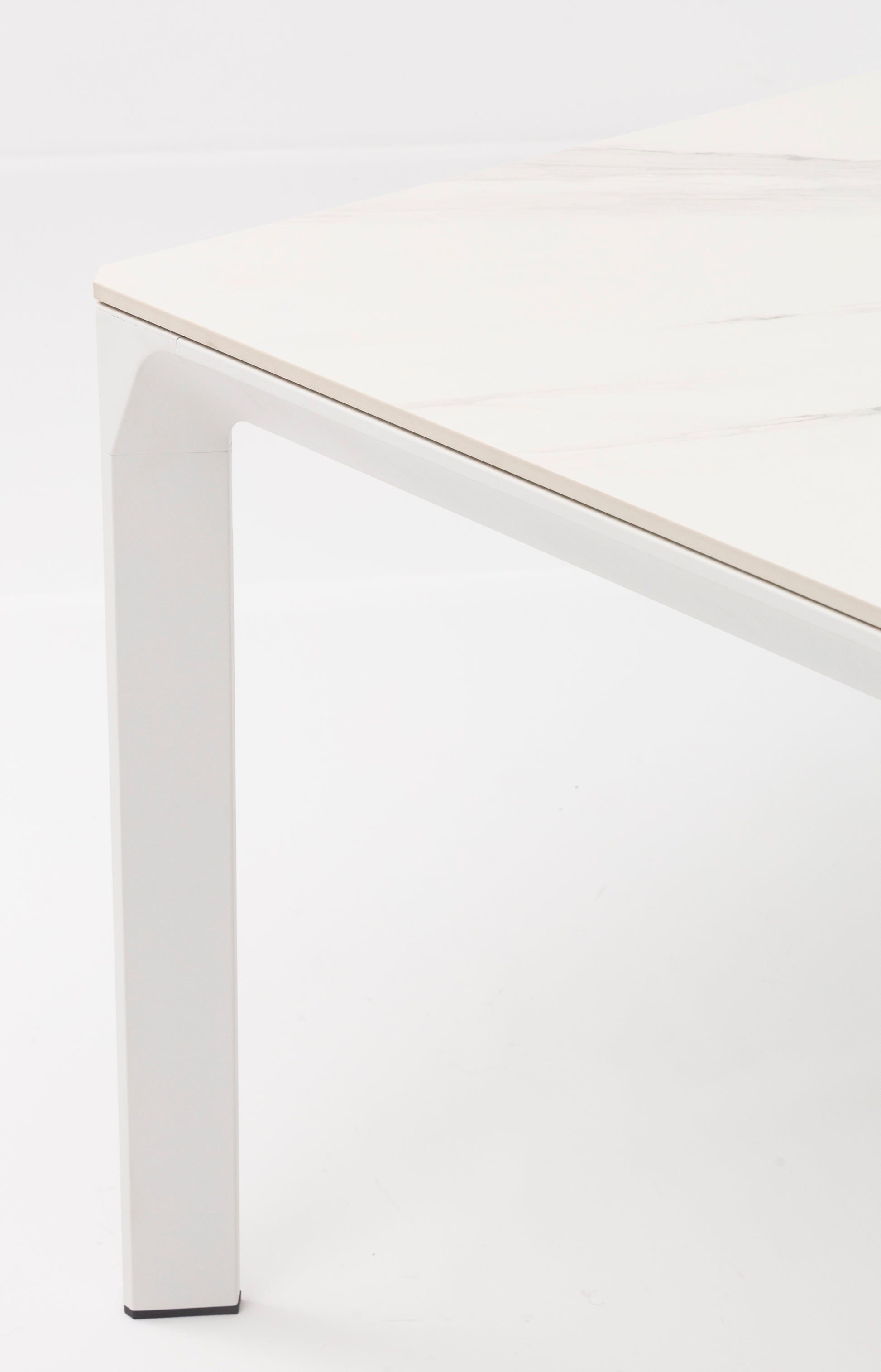 El top de piedra sinterizada con efecto mármol blanco es el protagonista de esta mesa. Este material de alta tecnología ofrece la estética del mármol natural sin sus inconvenientes: es resistente a manchas, rayones, altas temperaturas y condiciones climáticas extremas. Con un grosor de 1,2 cm, la encimera es robusta y elegante a partes iguales.