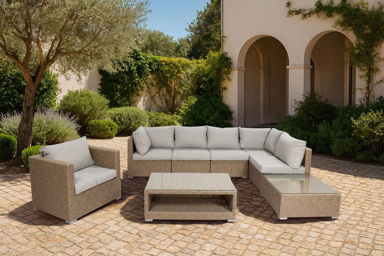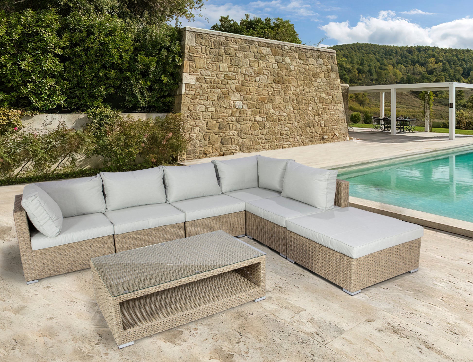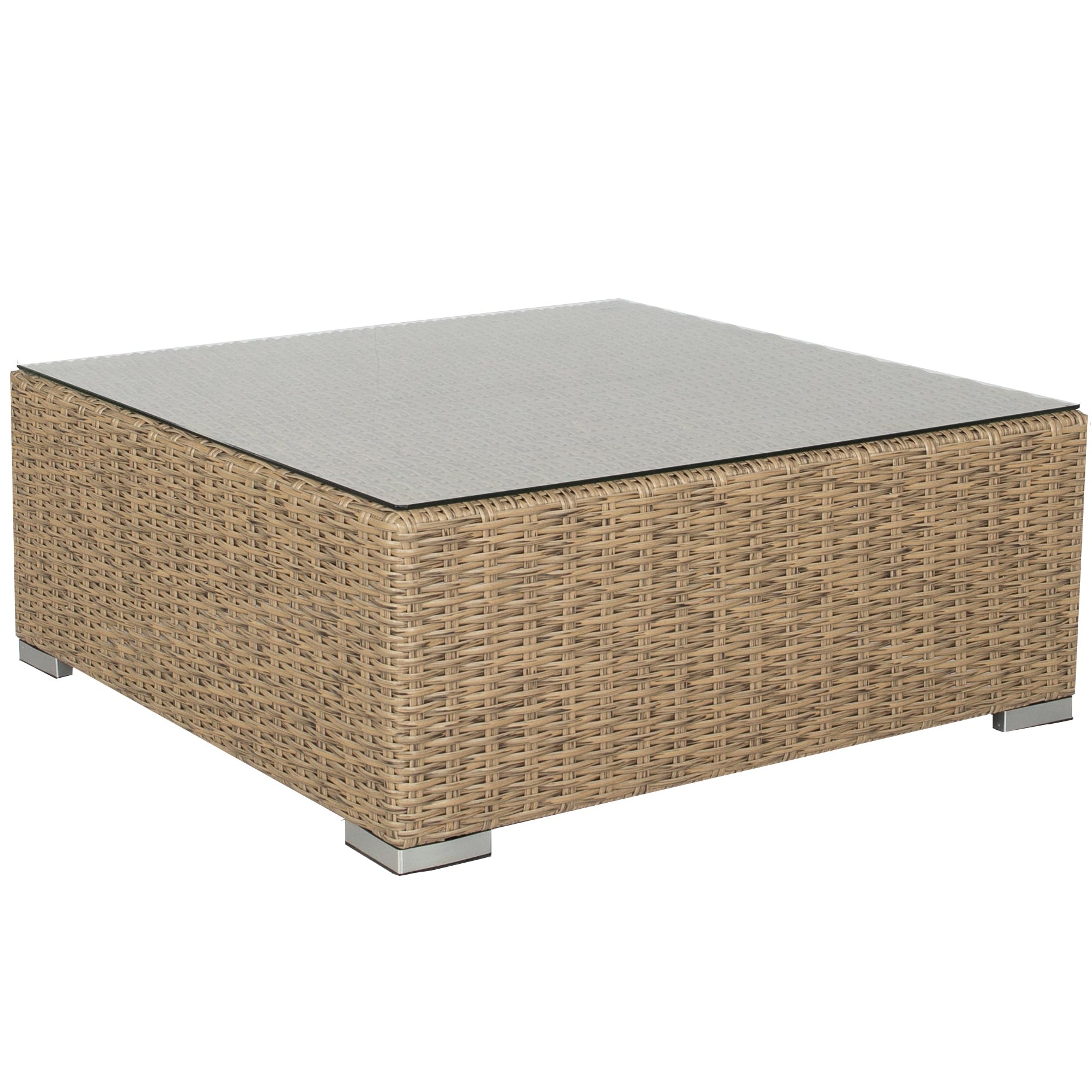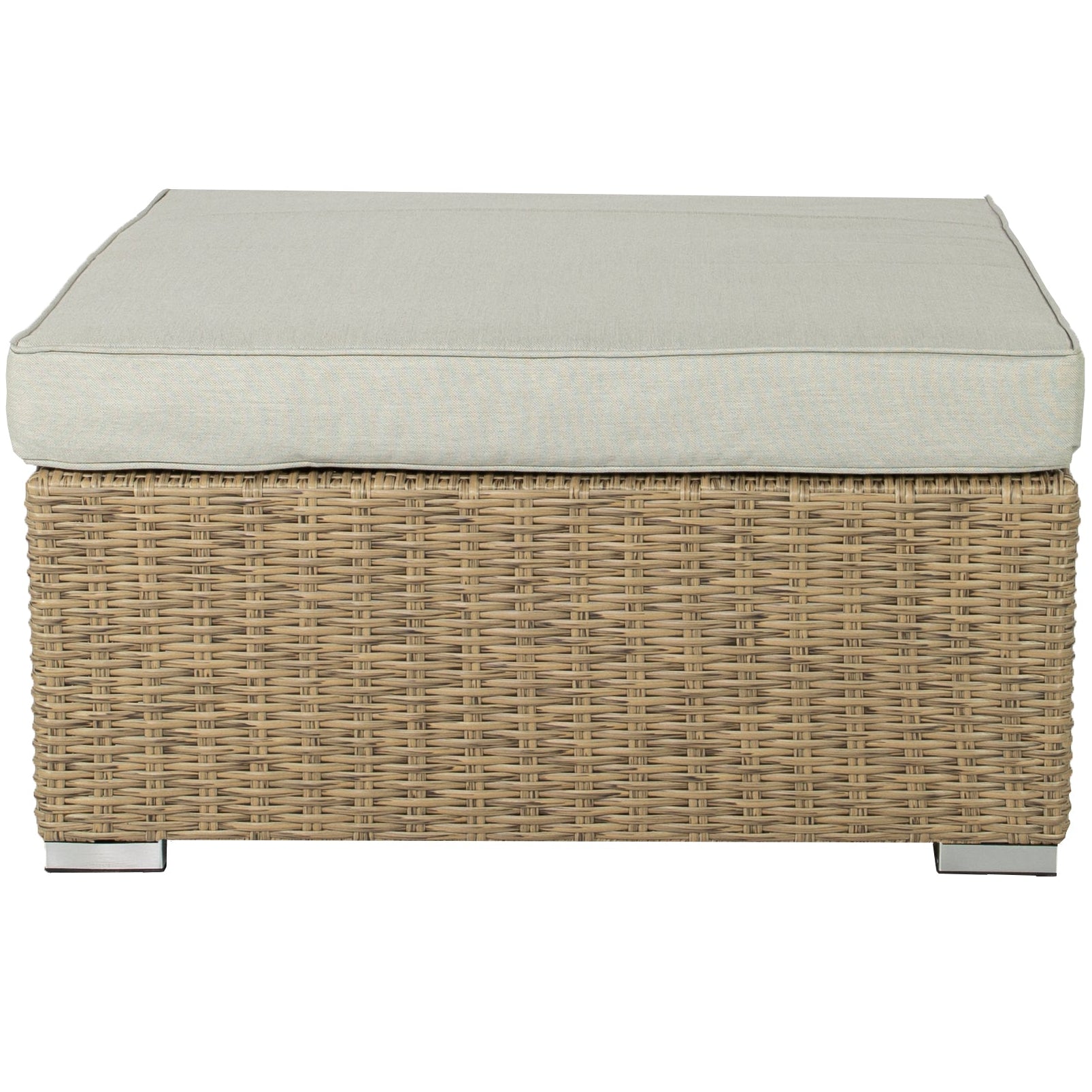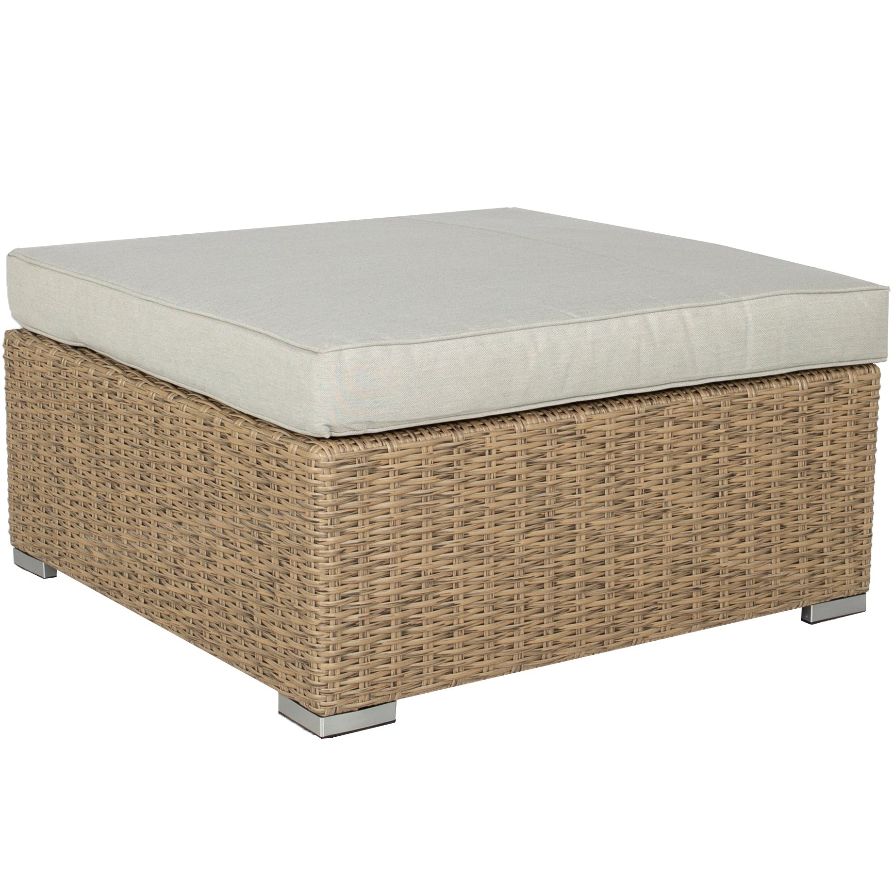 Mesa / Puf California. Estructura en aluminio lacado y ratán sintético halfround Ø 5 mm efecto nature con cojín de 10 cm. Incluye cristal templado de 5mm para conversión en mesa..