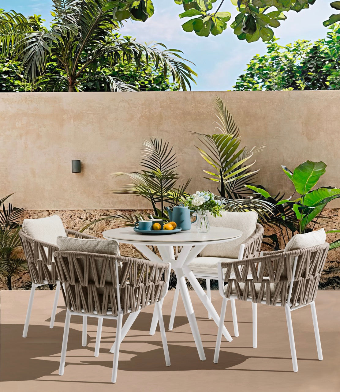 Los muebles de aluminio de alta calidad emplean aleaciones duraderas y tratamientos que refuerzan sus propiedades mecánicas y físicas. Antes del pintado, se aplica un tratamiento químico ecológico no crómico que limpia la superficie e impide la corrosión por óxido. Varias capas de pintura a presión con filtro UV garantizan máxima resistencia a la decoloración y a las inclemencias del tiempo.