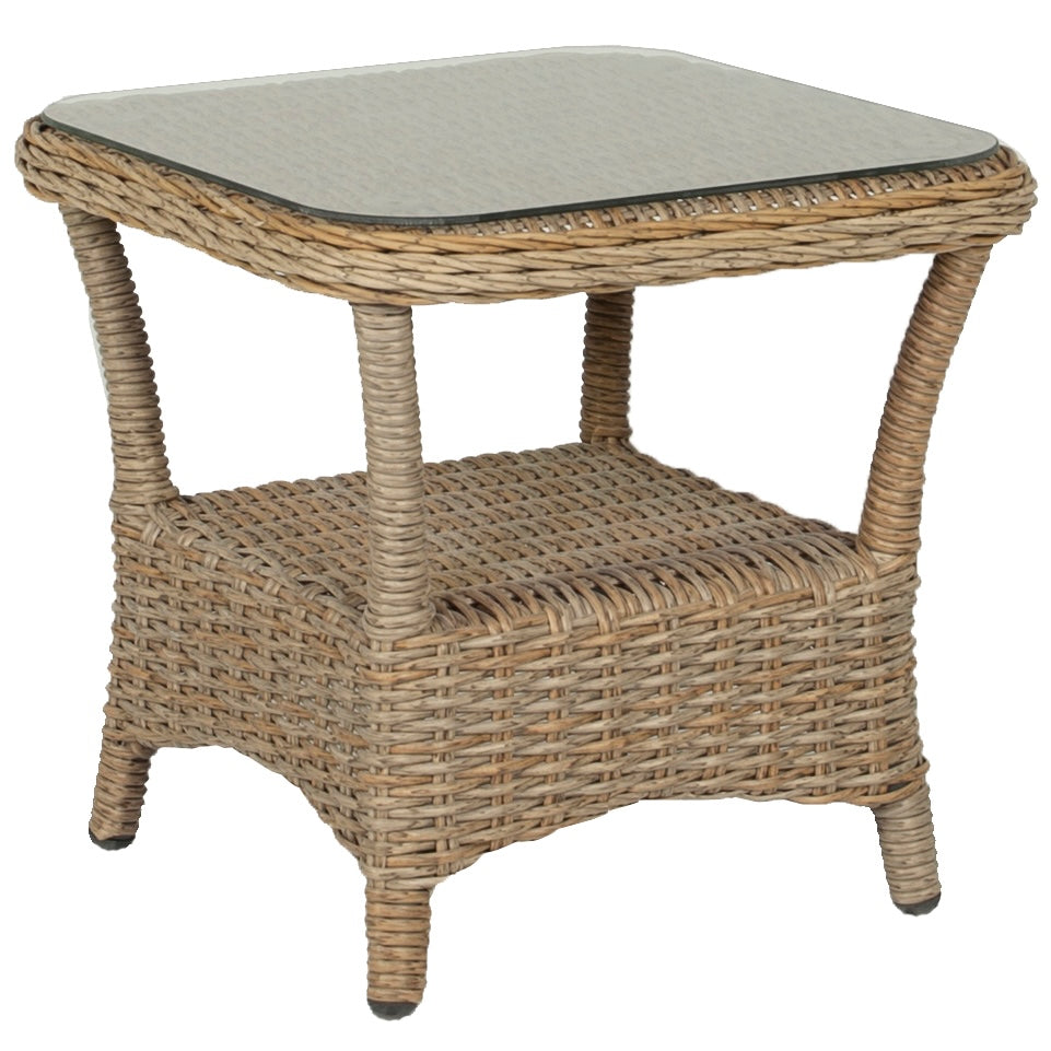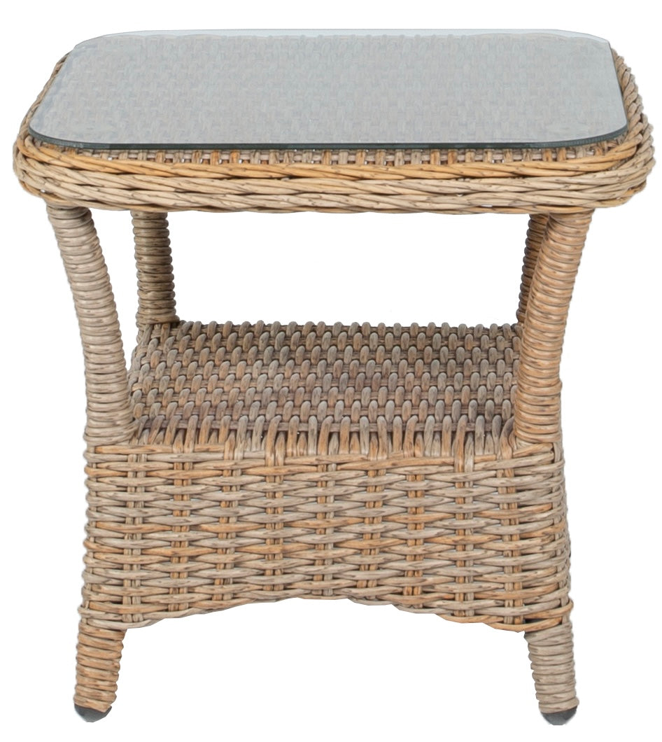 Mesita auxiliar Oregón. Estructura en aluminio lacado y ratán sintético halfround diam. 5 mm efecto nature con cristal templado de 5 mm..