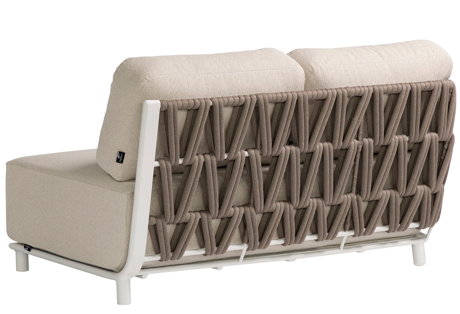 Módulo 2 plazas Carson brazo izquierdo (VF). Estructura en aluminio blanco combinado con cuerda náutica de 19 mm color greige. Cojínes de asiento (30 cm) y respaldo (15 cm) color beige con tratamiento waterproof..