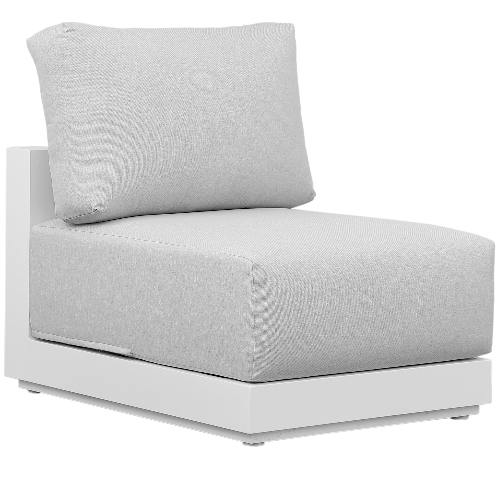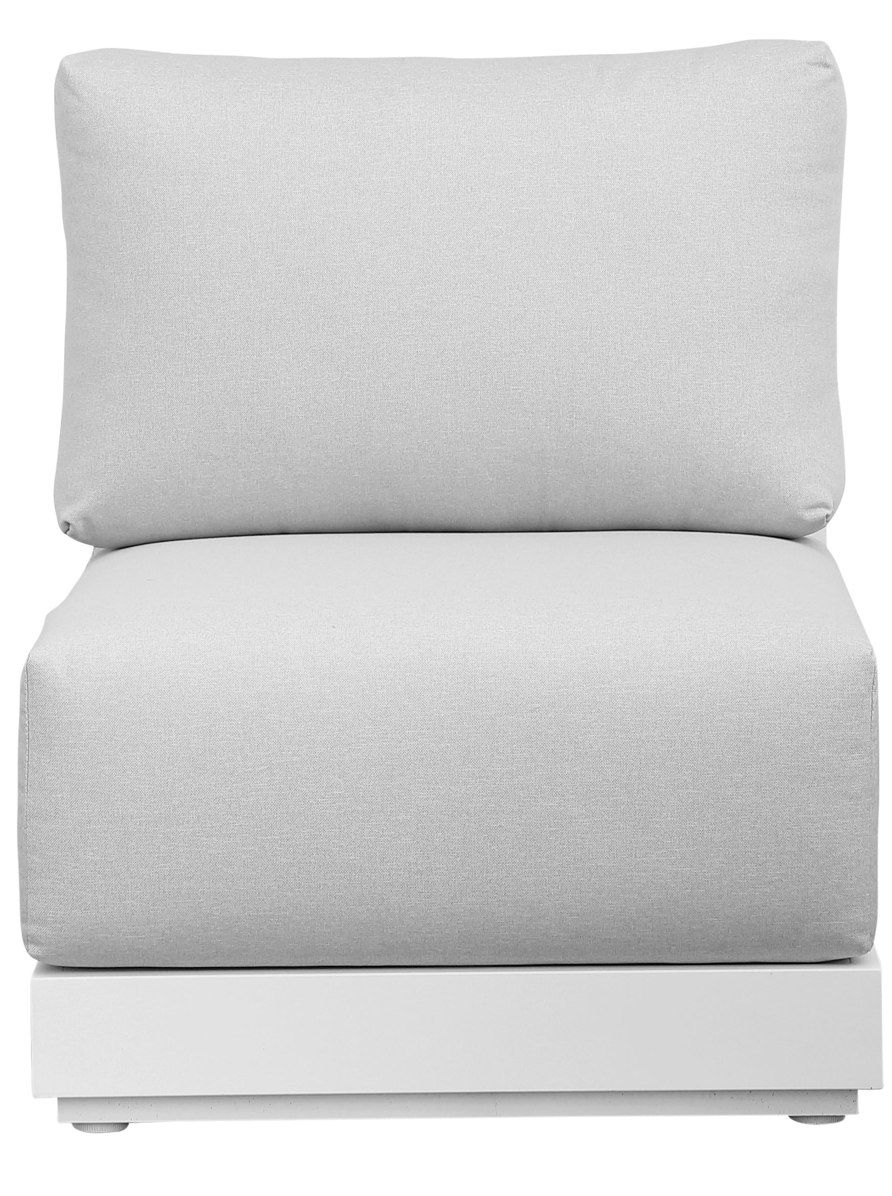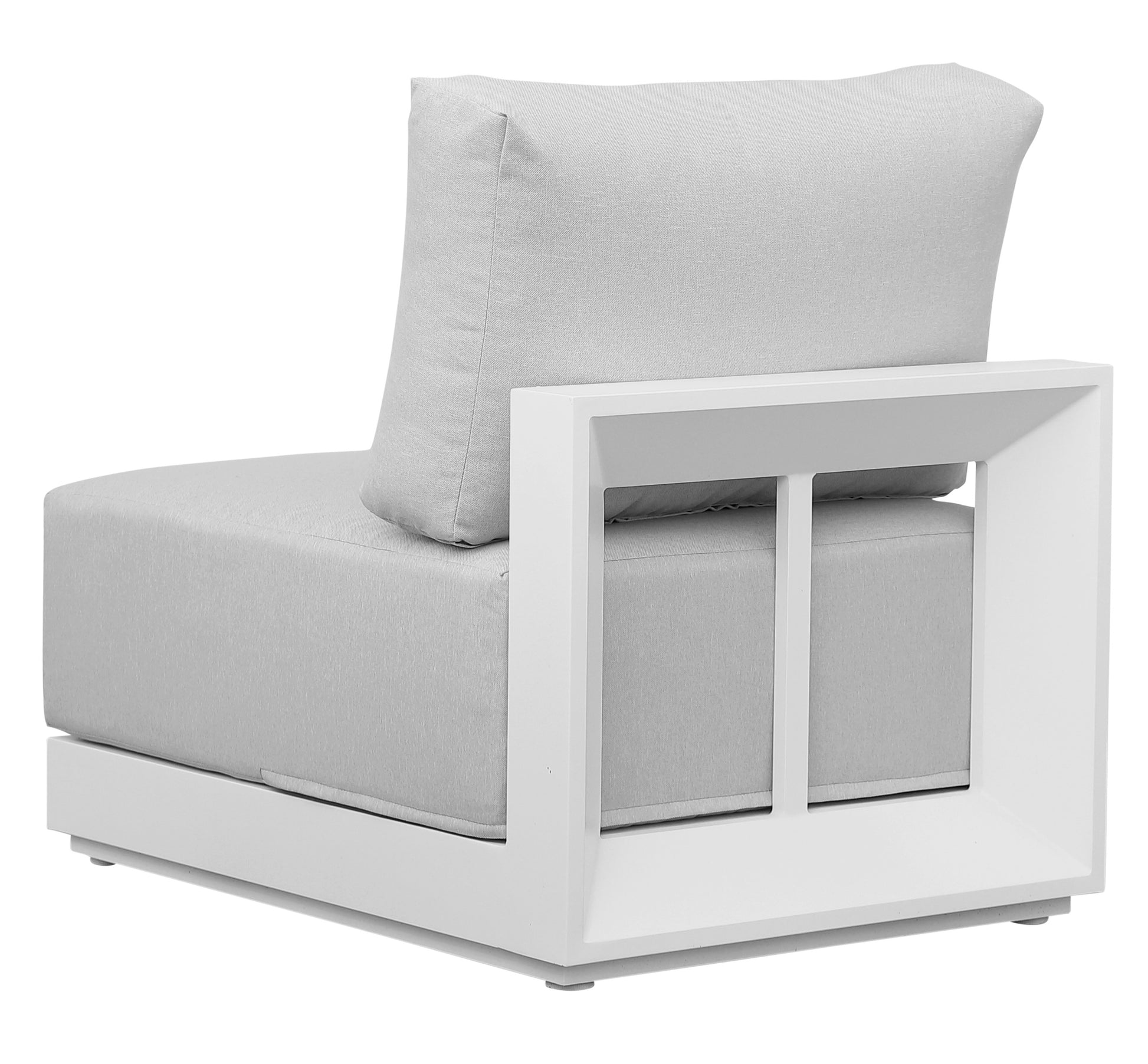 Módulo de ampliación Onix en aluminio blanco con cojinería gris claro – expande tu sofá a medida. Este módulo central sin brazos te permite ampliar tu configuración Onix añadiendo plazas adicionales entre sofás o creando composiciones personalizadas en L o U.