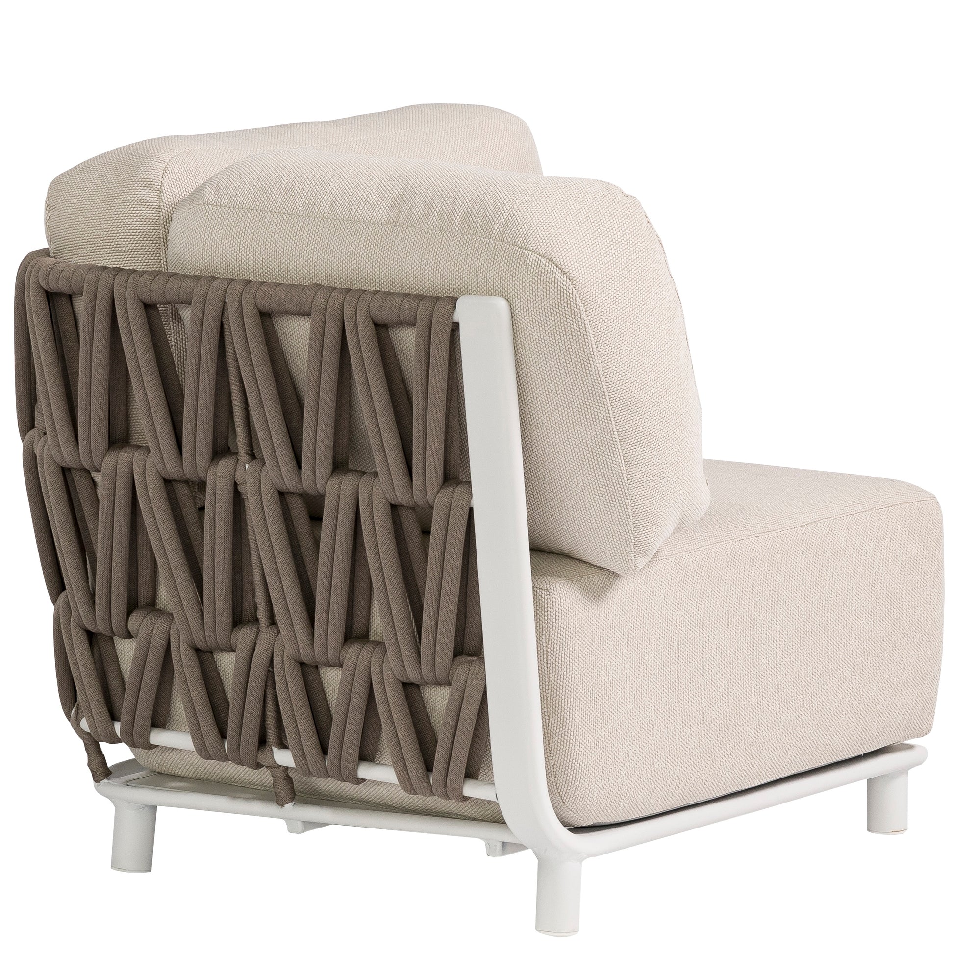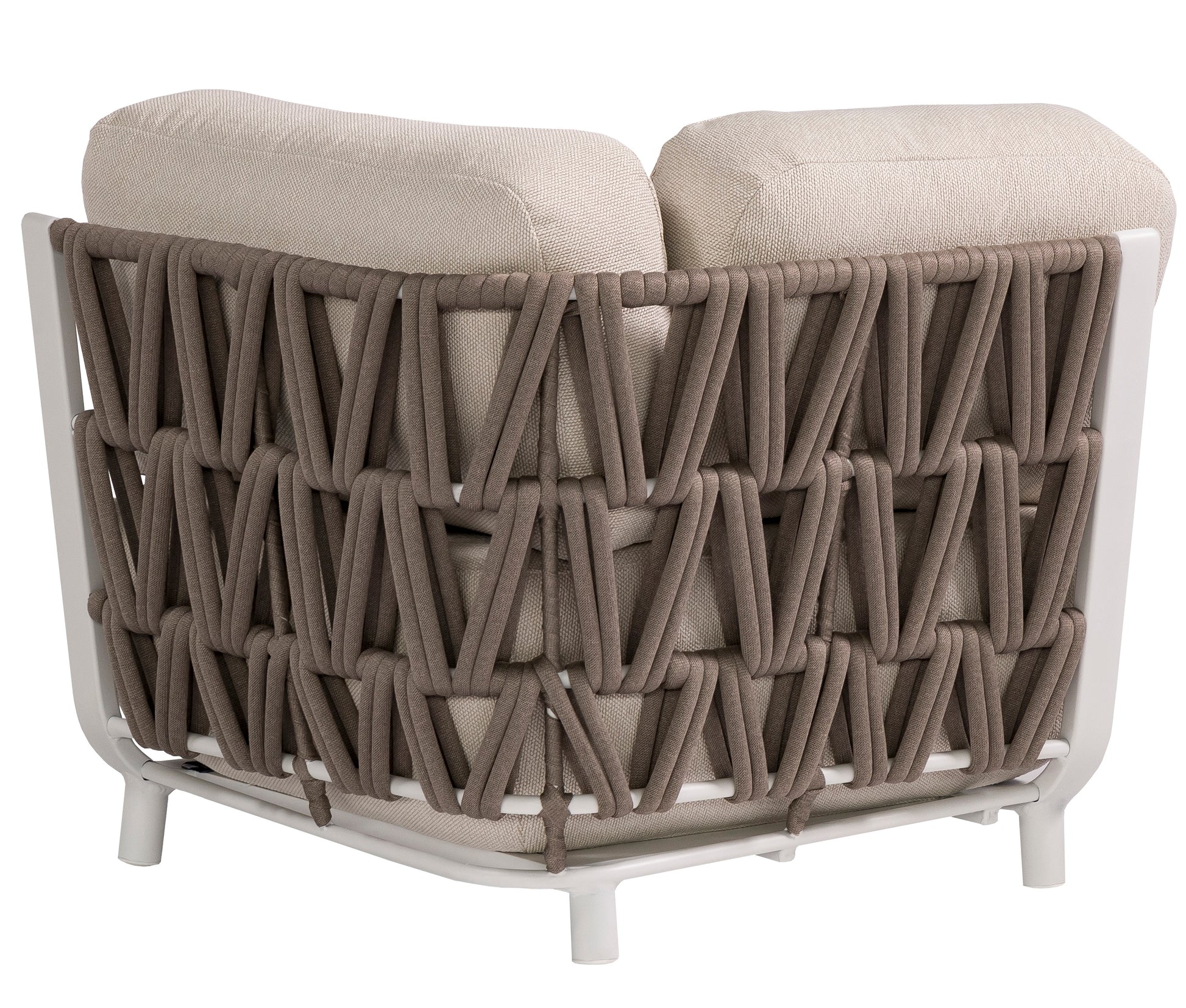 Módulo esquinero Carson. Estructura en aluminio blanco combinado con cuerda náutica de 19 mm color greige. Cojín de asiento (30 cm) y respaldo (15 cm) color beige con tratamiento waterproof..