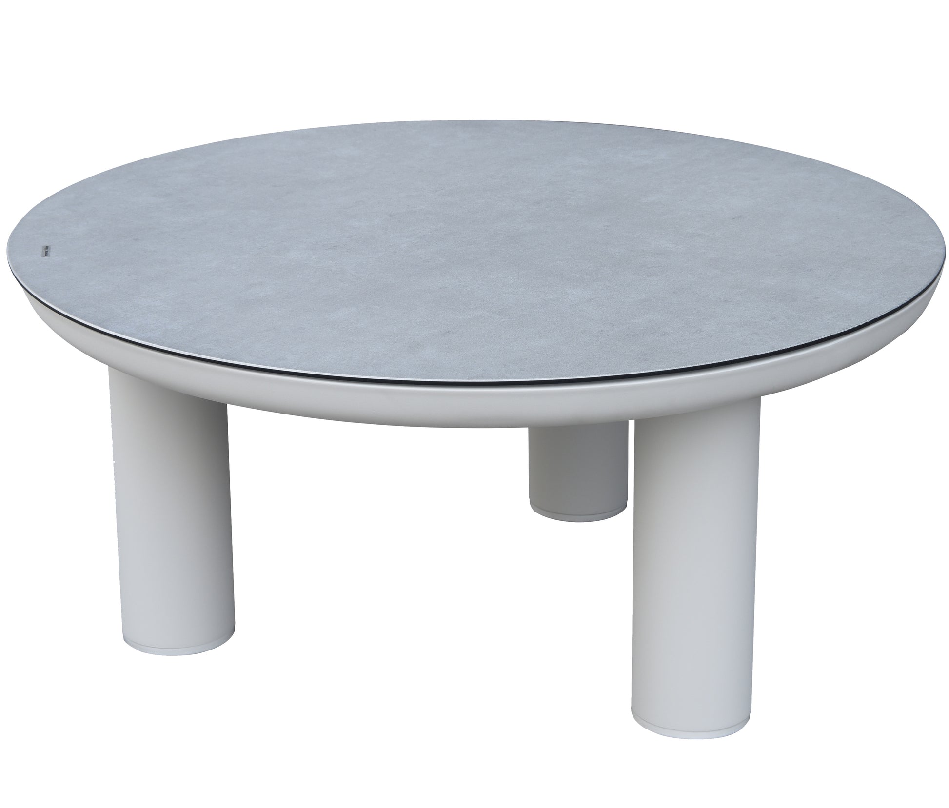 Set de 2 mesas de centro Attica. Compuesto de dos mesas auxiliares (Ø 80x36 cm + Ø 60x30 cm). Estructura en aluminio. Top mesa en cristal cerámico 5mm gris claro. Requiere montaje.