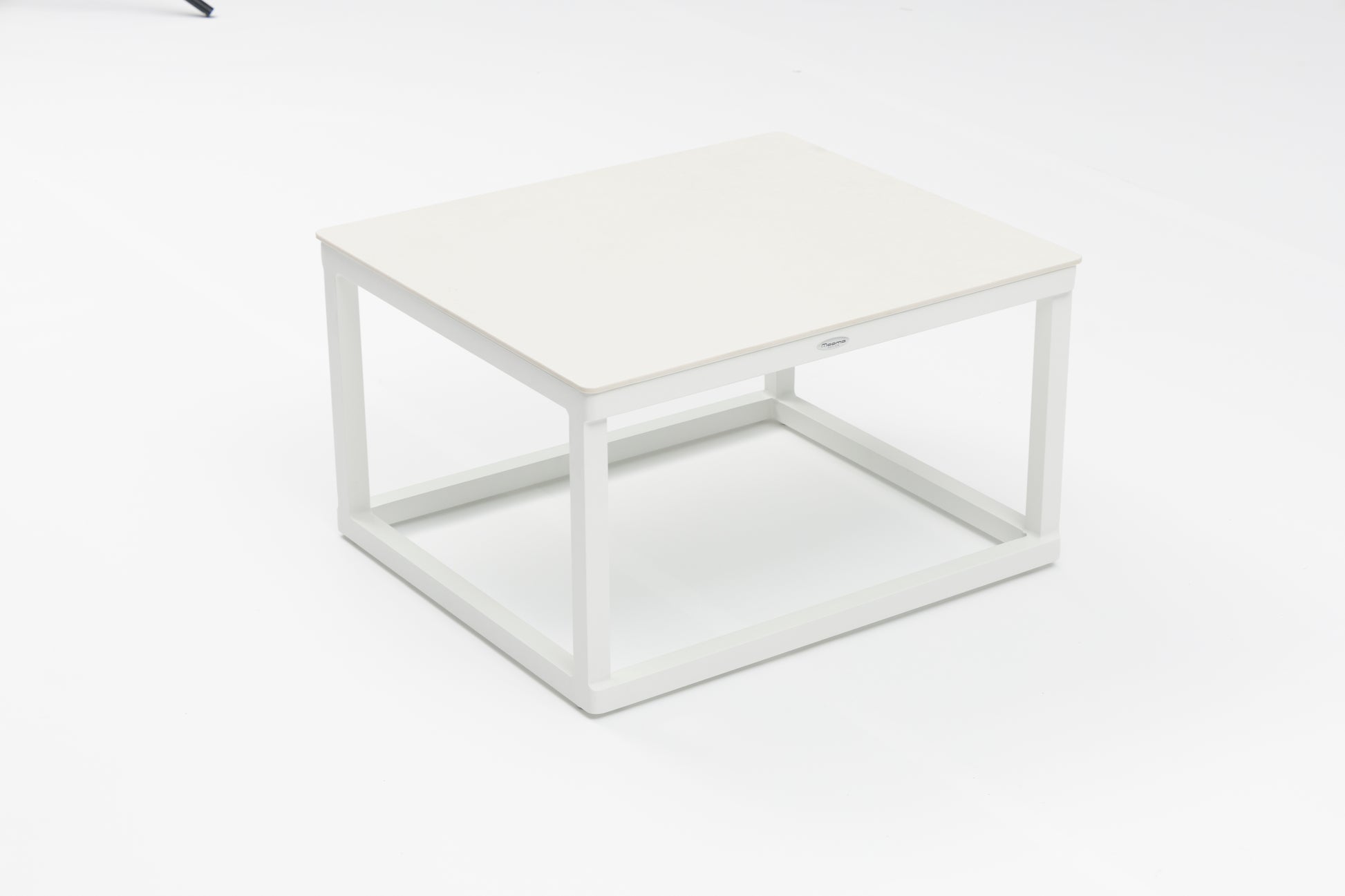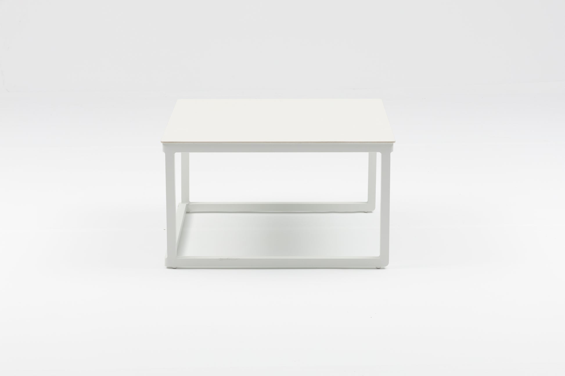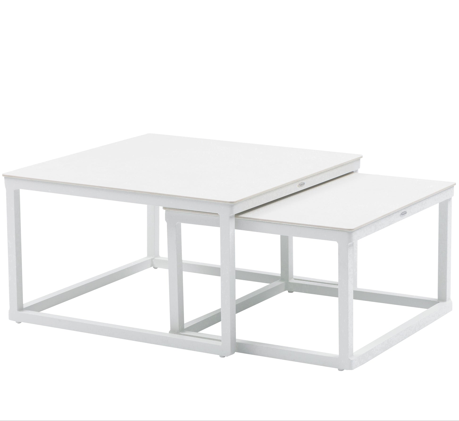 Set mesas auxiliares Silai compuesto de mesa alta (79x79x45 cm) + mesa baja (71x59x40 cm). Estructura en aluminio blanco con top porcelánico beige..