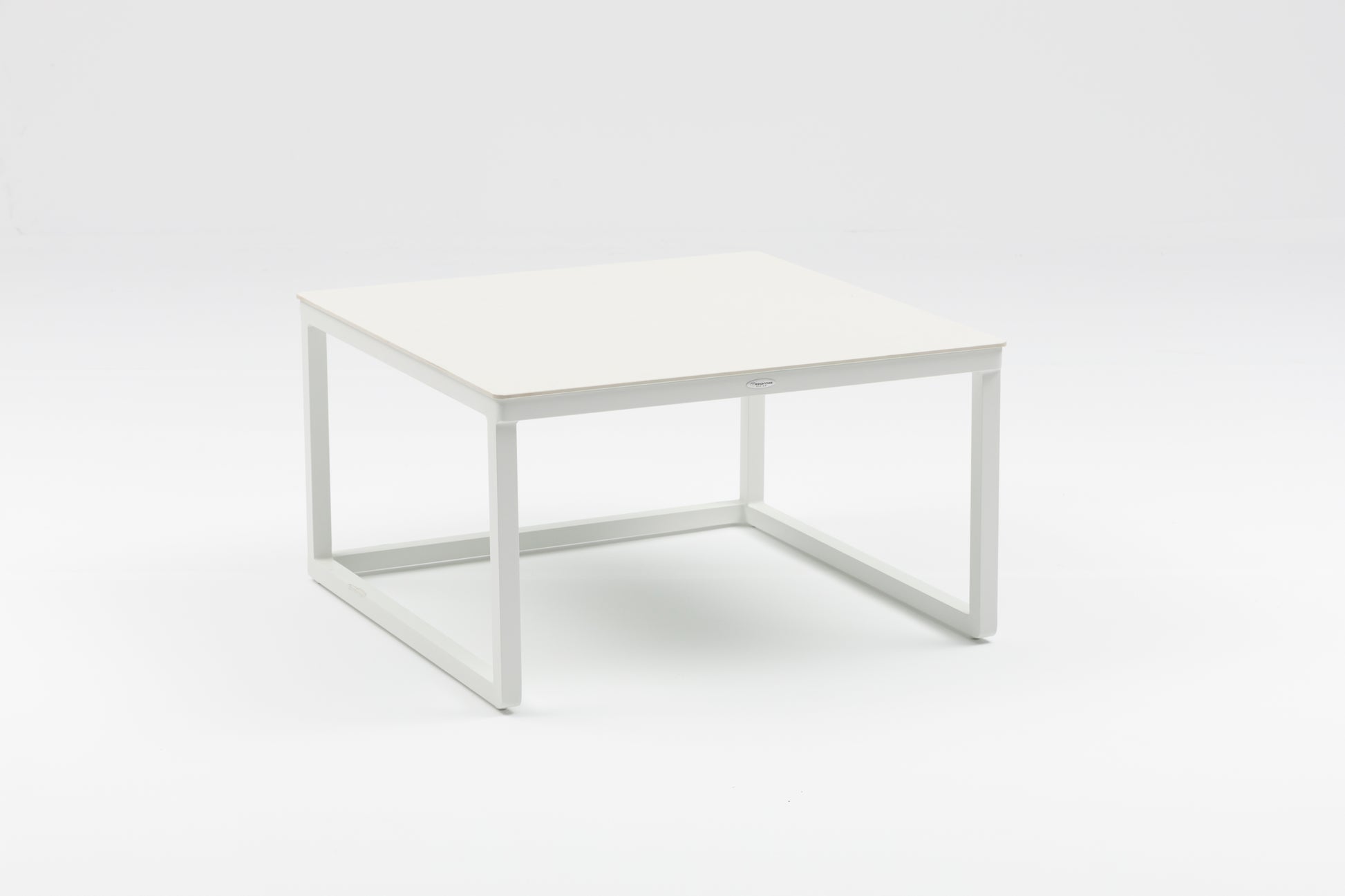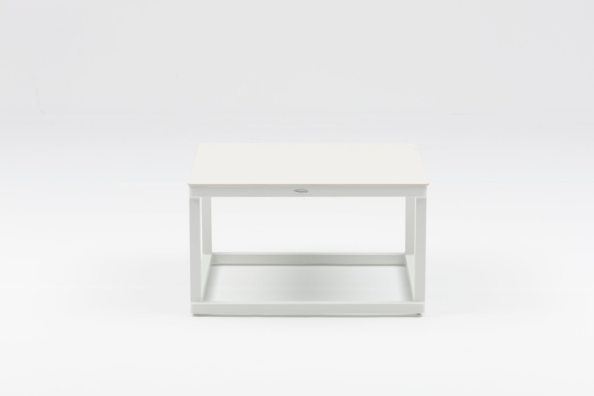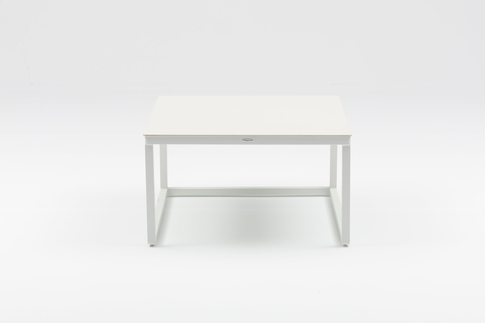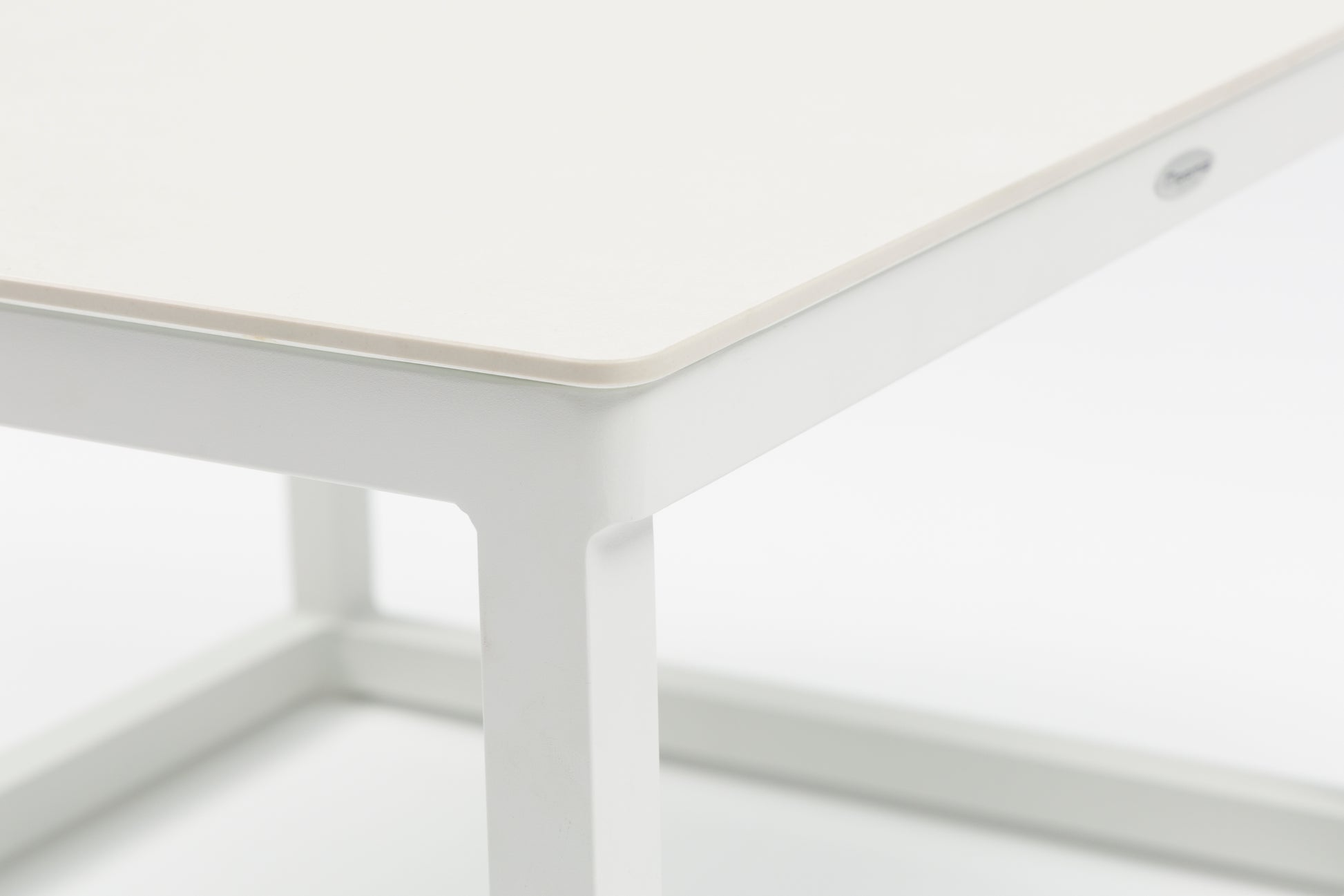Set mesas auxiliares Silai compuesto de mesa alta (79x79x45 cm) + mesa baja (71x59x40 cm). Estructura en aluminio blanco con top porcelánico beige..