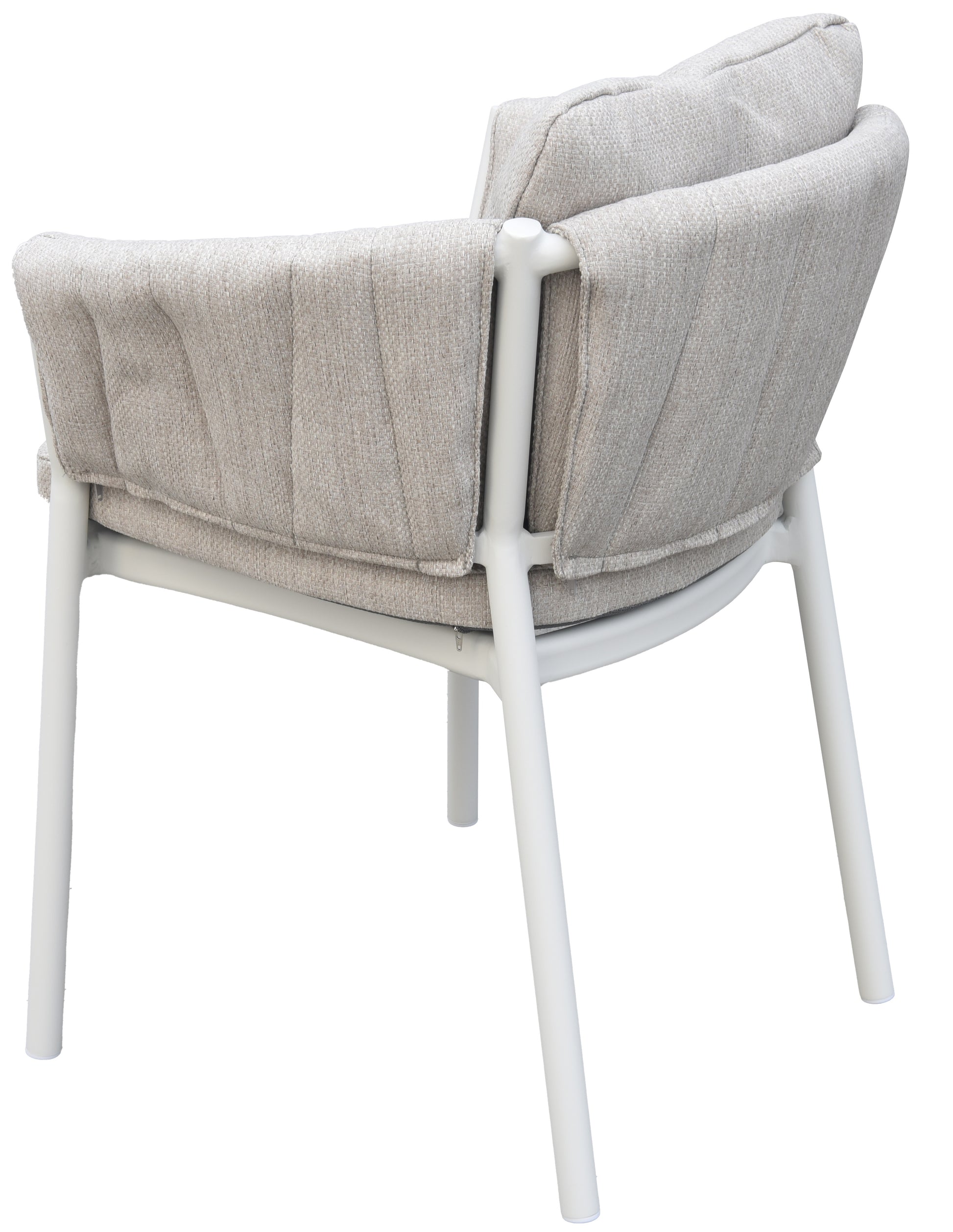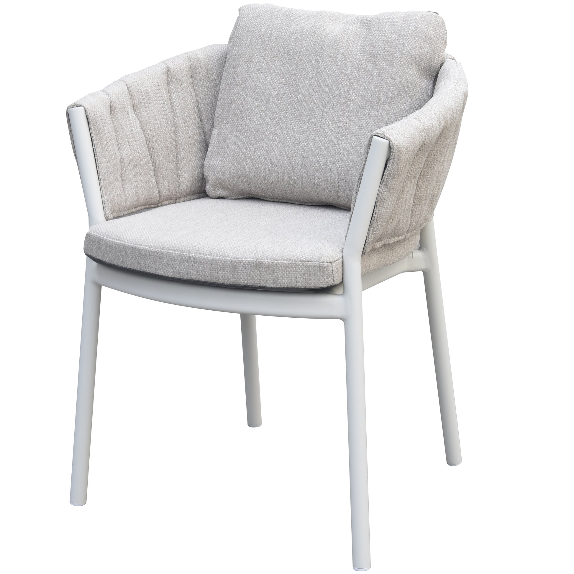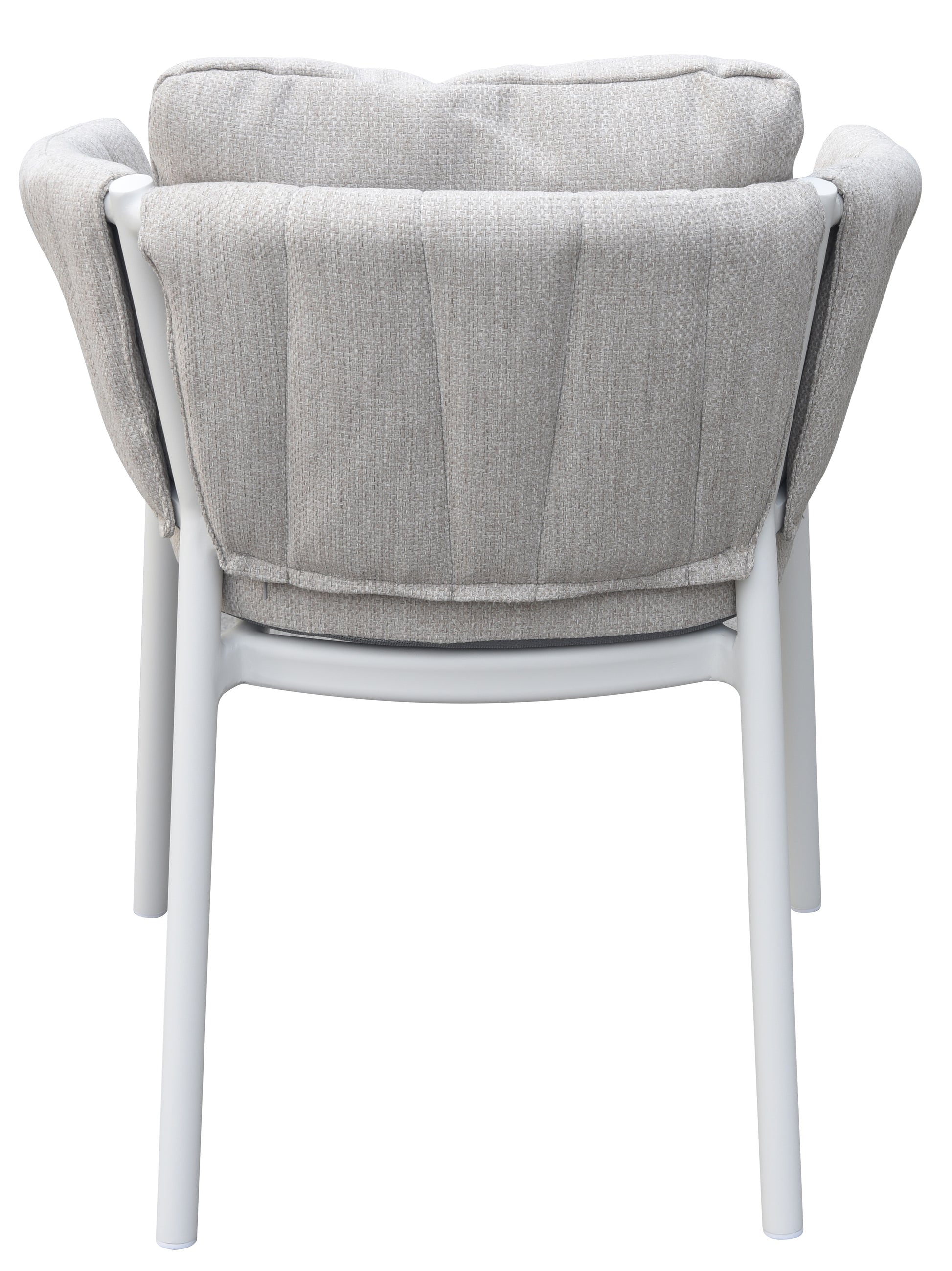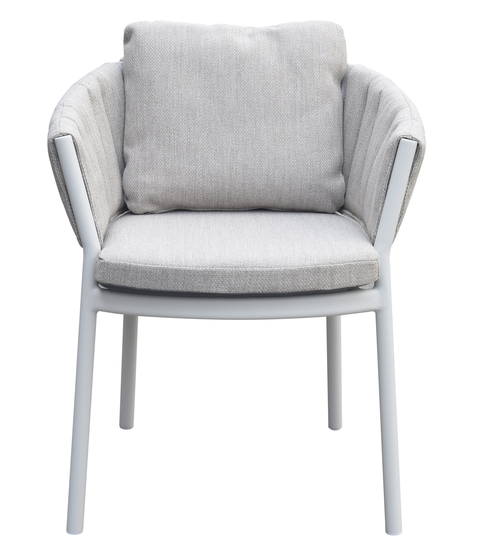 Sillón de comedor Attica. Estructura en aluminio blanco con recubrimiento en olefina textil gris claro. Cojín de asiento (4cm) y respaldo (4cm) color gris claro. Desenfundable.