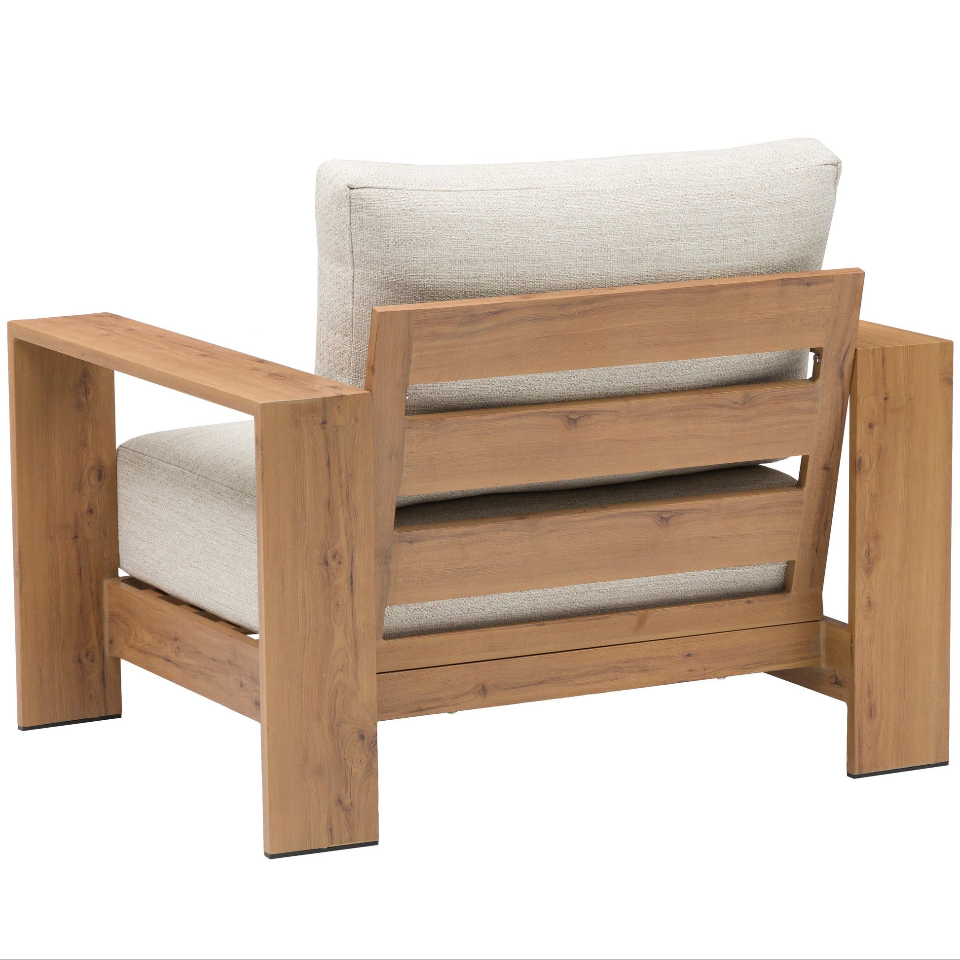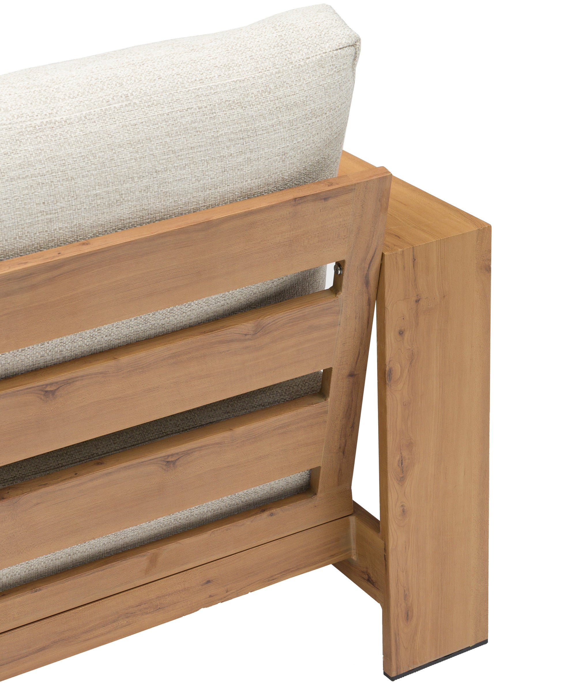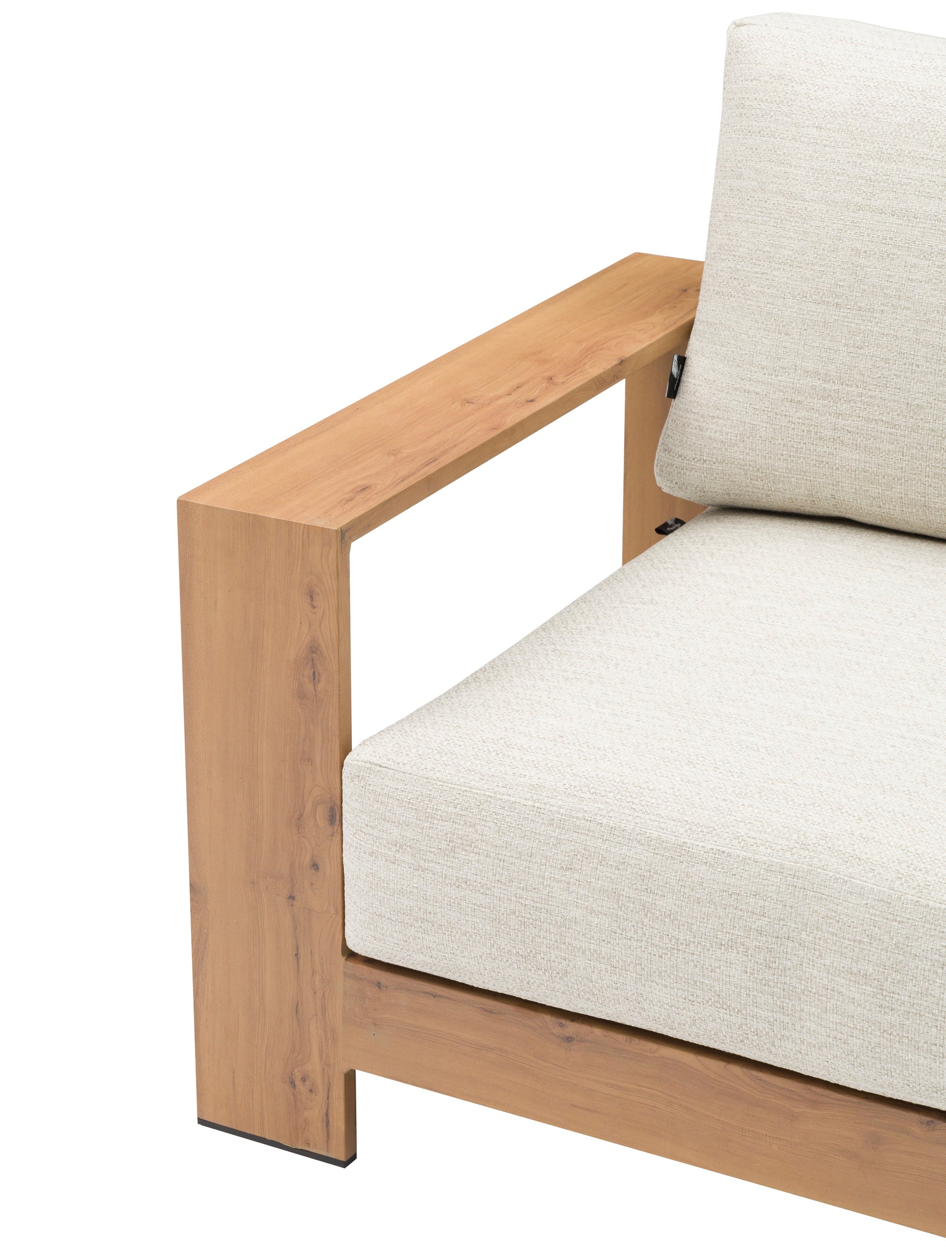 Sofá 1 plaza Java 100x85x68 cm. Estructura en aluminio recubierto por transferencia térmica efecto teca natural de alta durabilidad. Cojín de asiento (20 cm) y respaldo (25 cm) en tejido in & out beige. Requiere montaje..