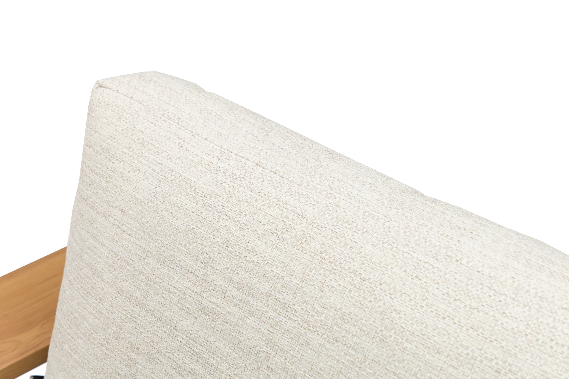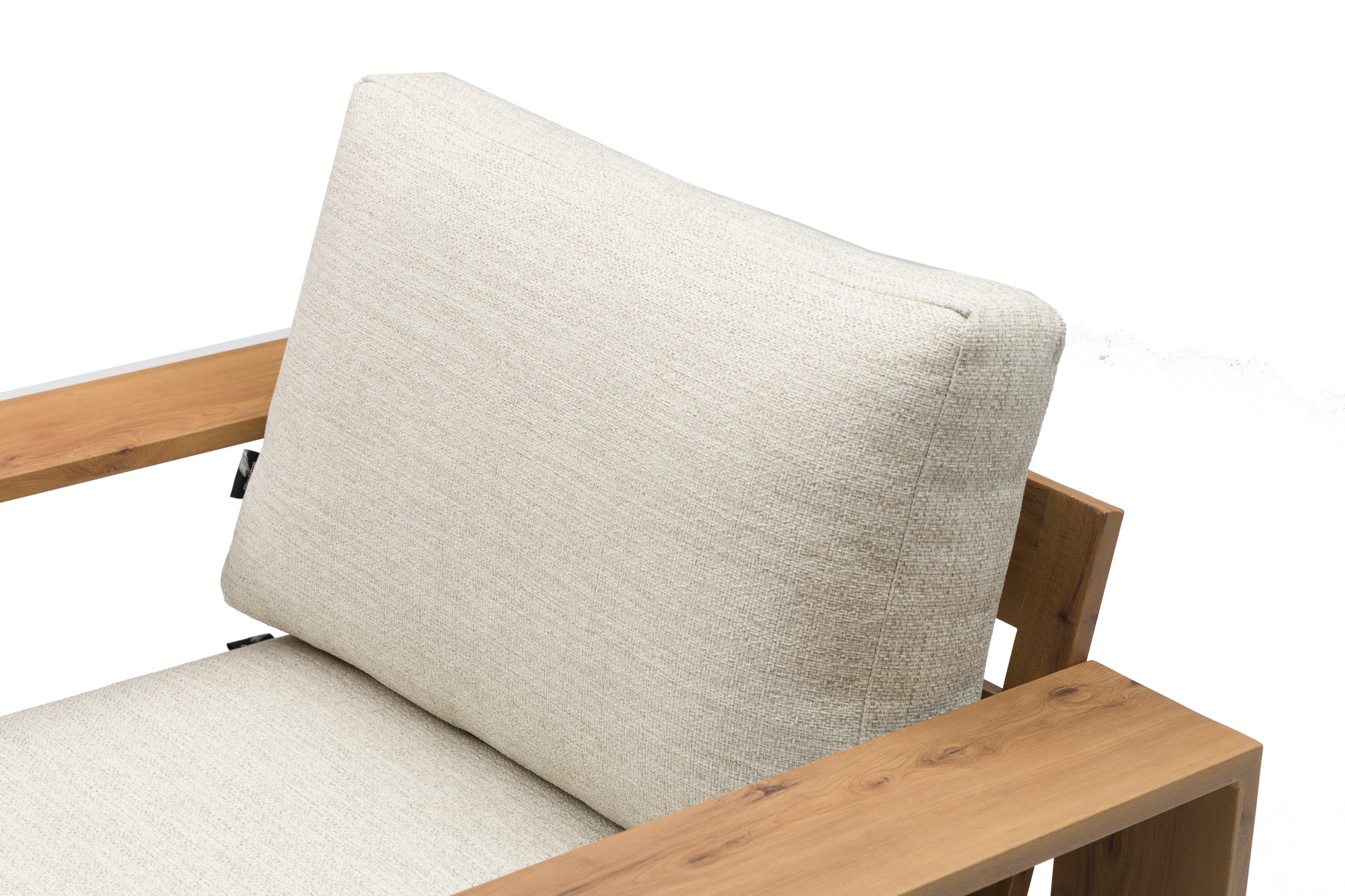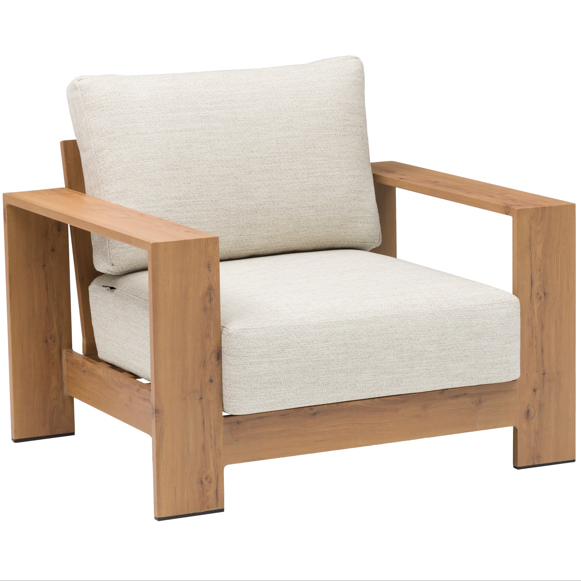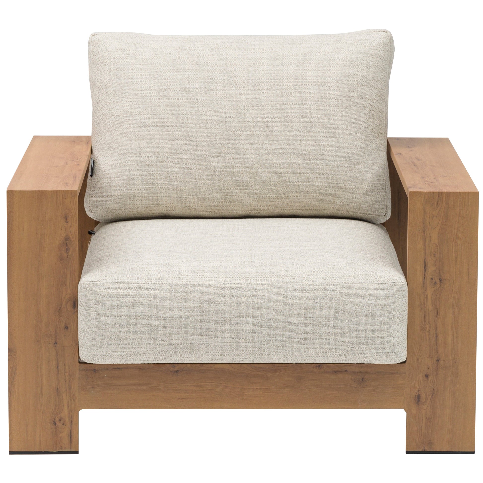 Sofá 1 plaza Java 100x85x68 cm. Estructura en aluminio recubierto por transferencia térmica efecto teca natural de alta durabilidad. Cojín de asiento (20 cm) y respaldo (25 cm) en tejido in & out beige. Requiere montaje..