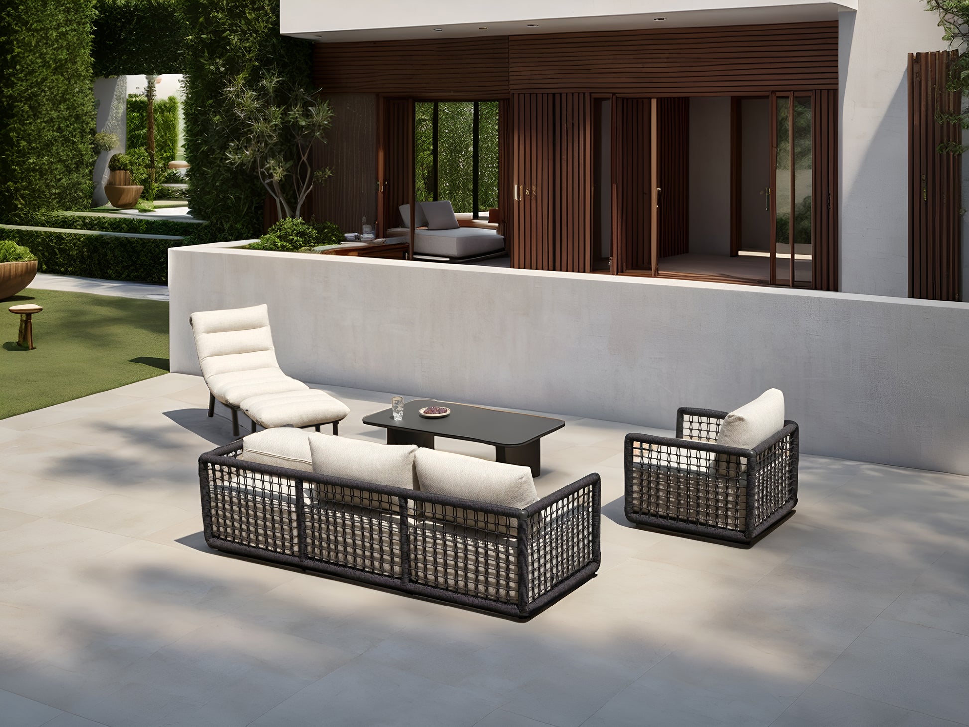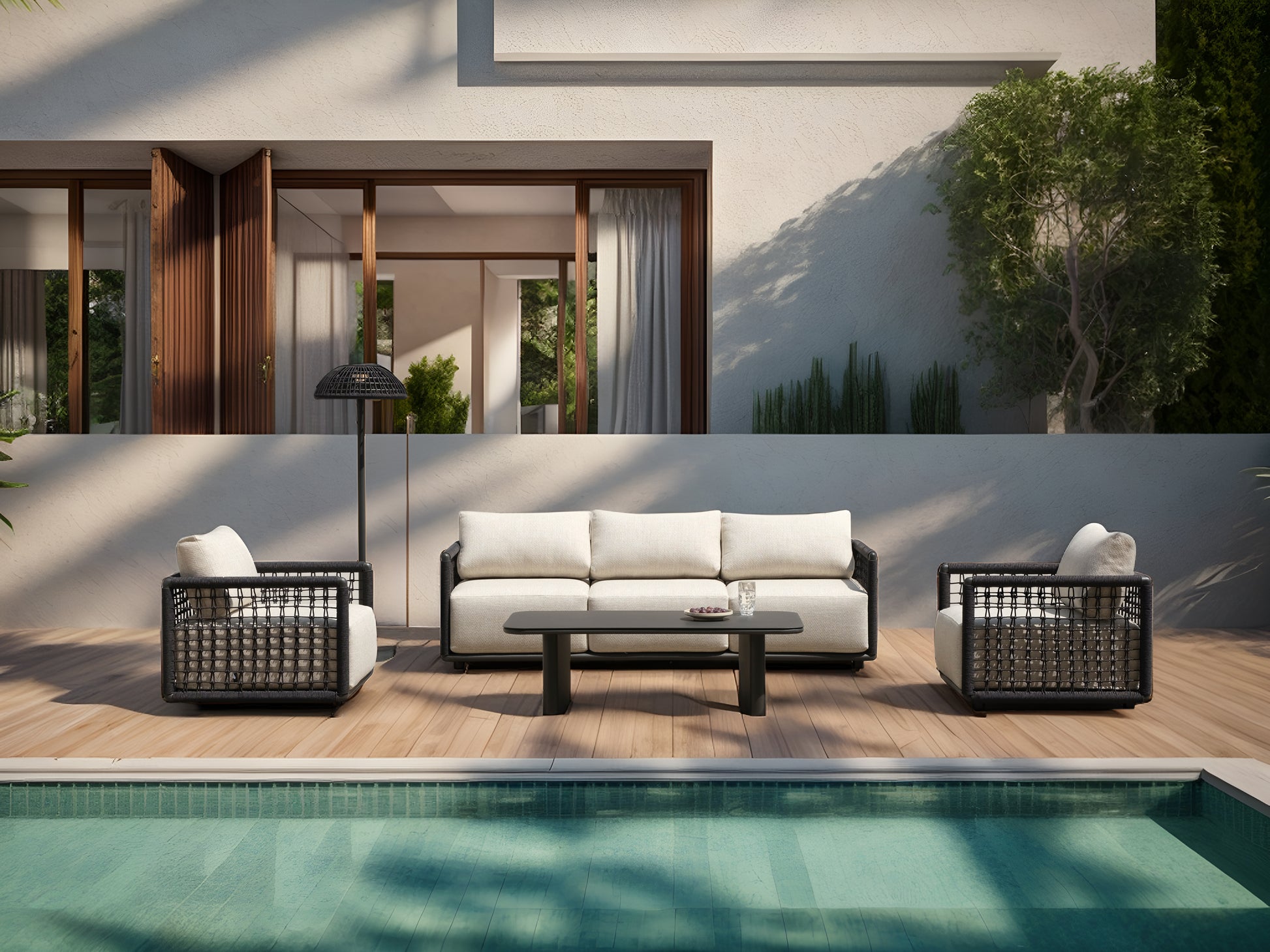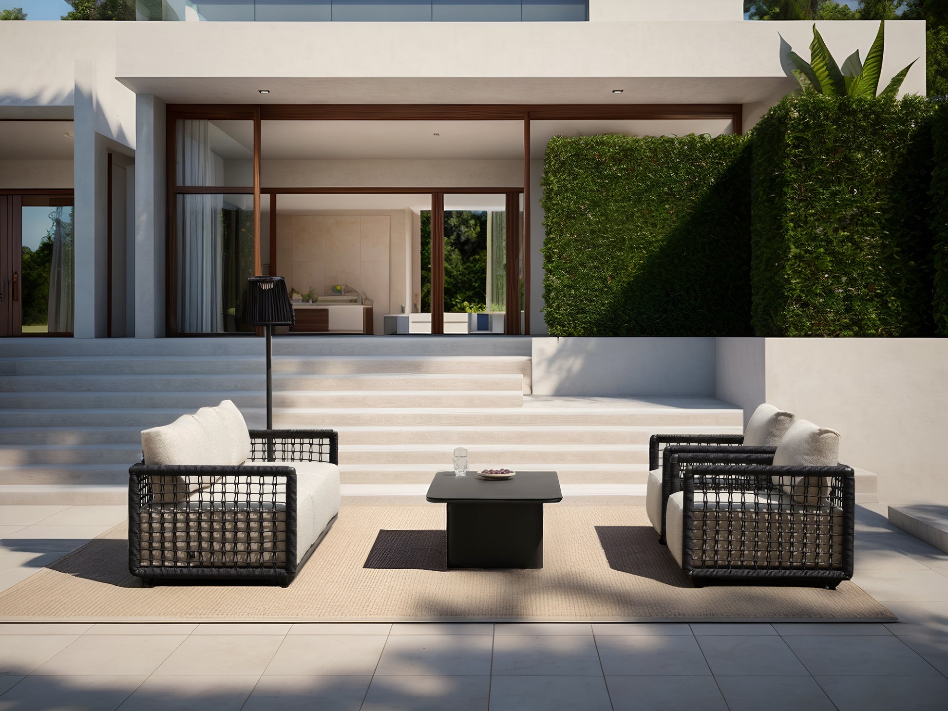 Cada estructura refuerza sus puntos de carga con tornillería y apliques de primera calidad y listones sobredimensionados. Incorporamos materiales premium como Textilene Batyline, tapicerías waterproof, espumas de alta densidad y encimeras de cristal templado. Todo diseñado para lograr un mueble resistente, cómodo y funcional en cualquier espacio exterior.