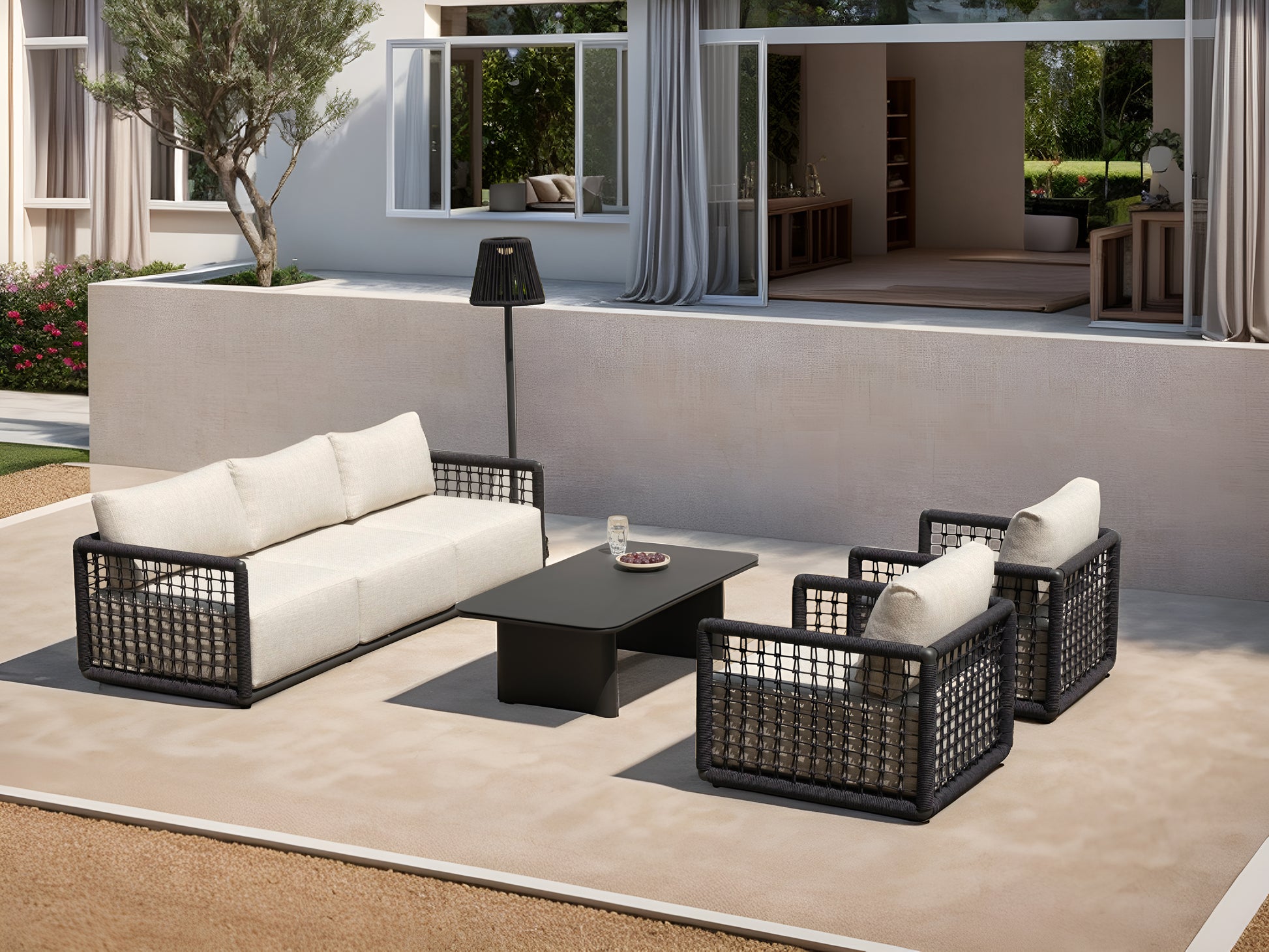 Sofá 1 plaza Santa Ana. Estructura en aluminio color antracita combinado con cuerda antracita 6 mm. Cojín de asiento y respaldo color beige..