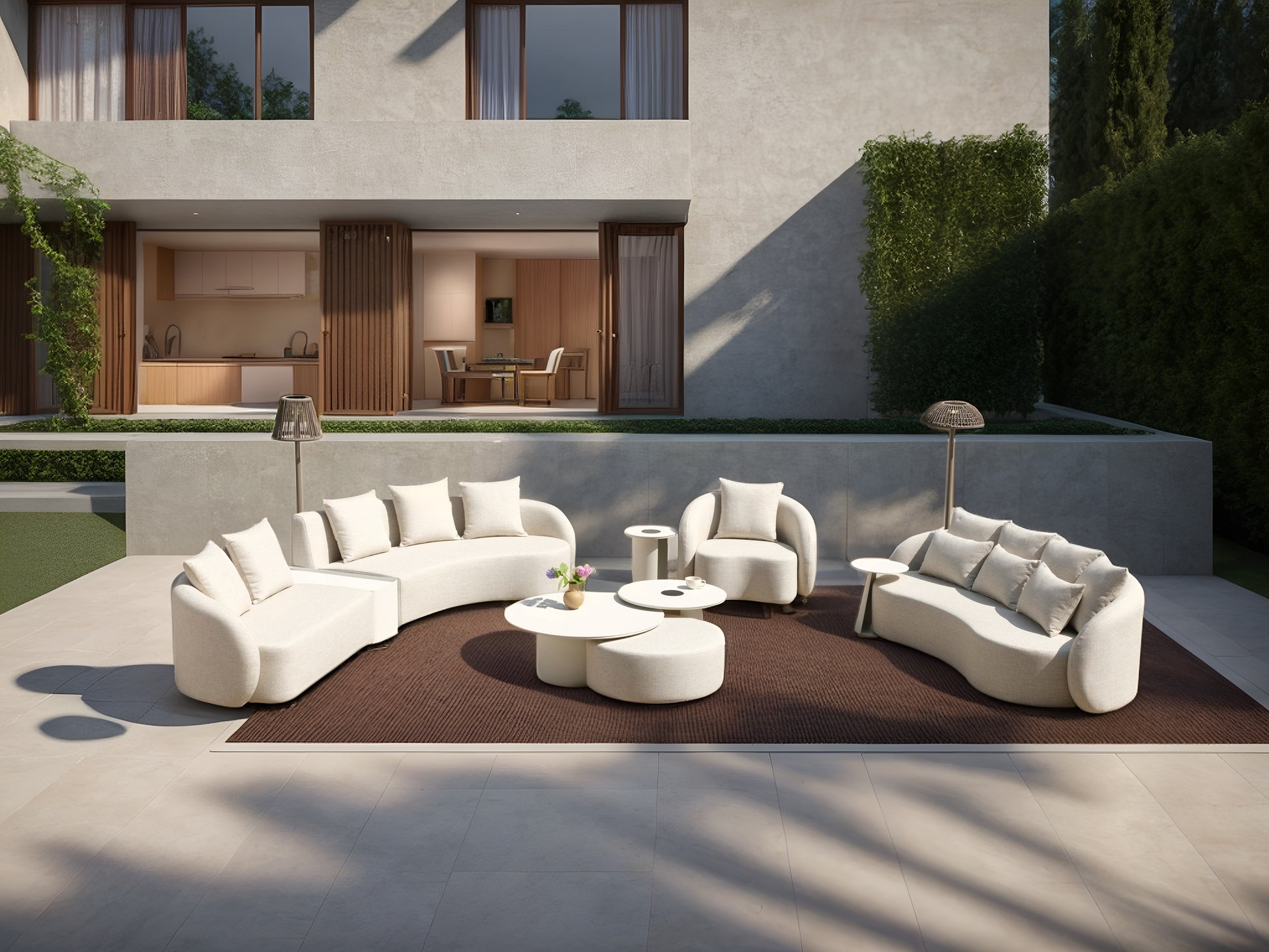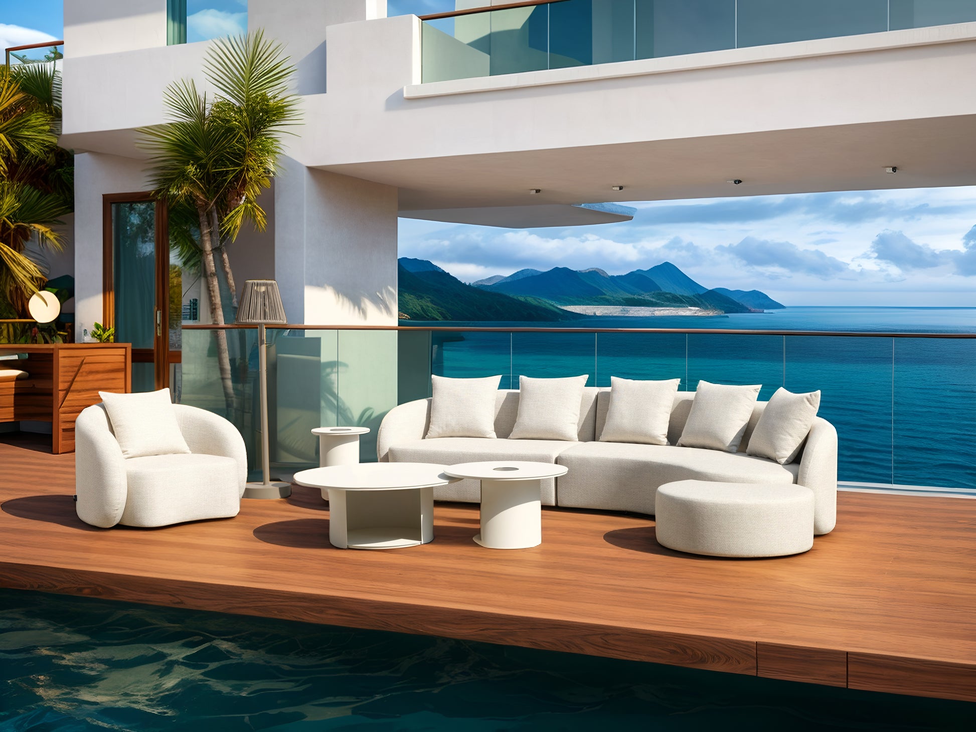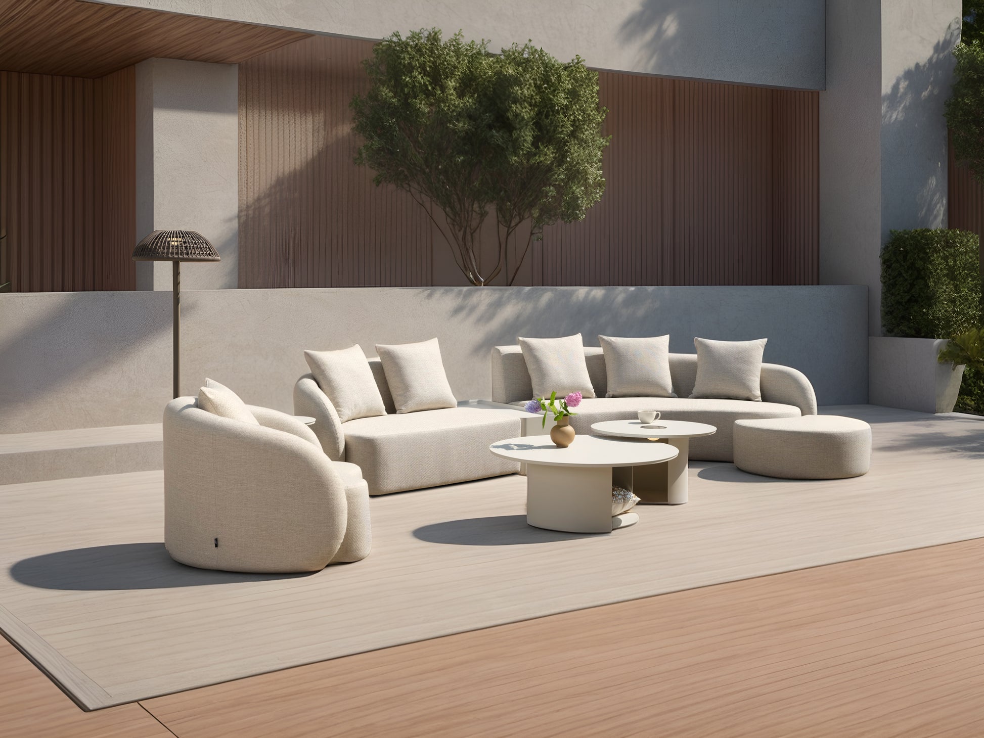 Cada estructura refuerza sus puntos de carga con tornillería y apliques de primera calidad y listones sobredimensionados. Incorporamos materiales premium como Textilene Batyline, tapicerías waterproof, espumas de alta densidad y encimeras de cristal templado. Todo diseñado para lograr un mueble resistente, cómodo y funcional en cualquier espacio exterior.