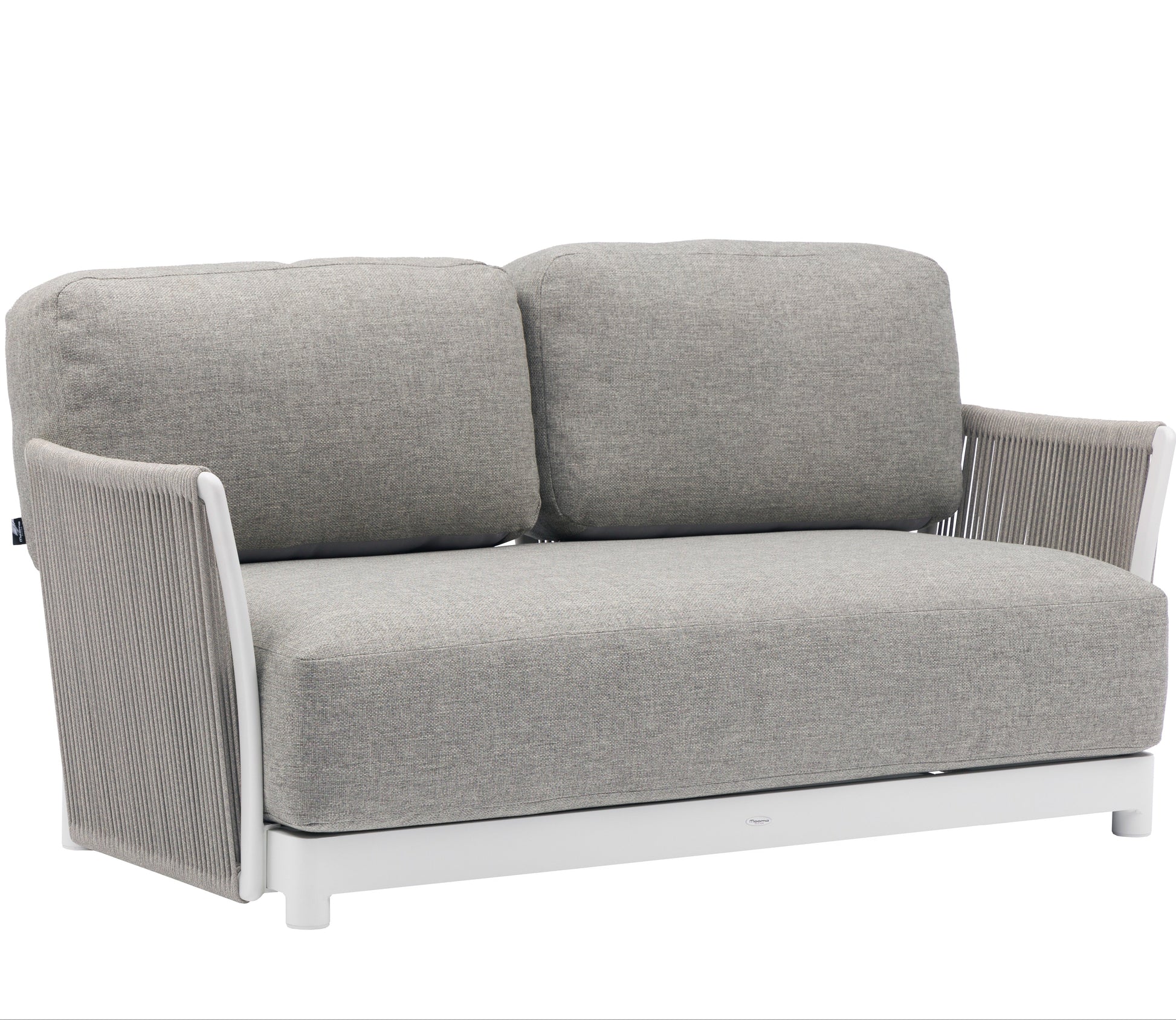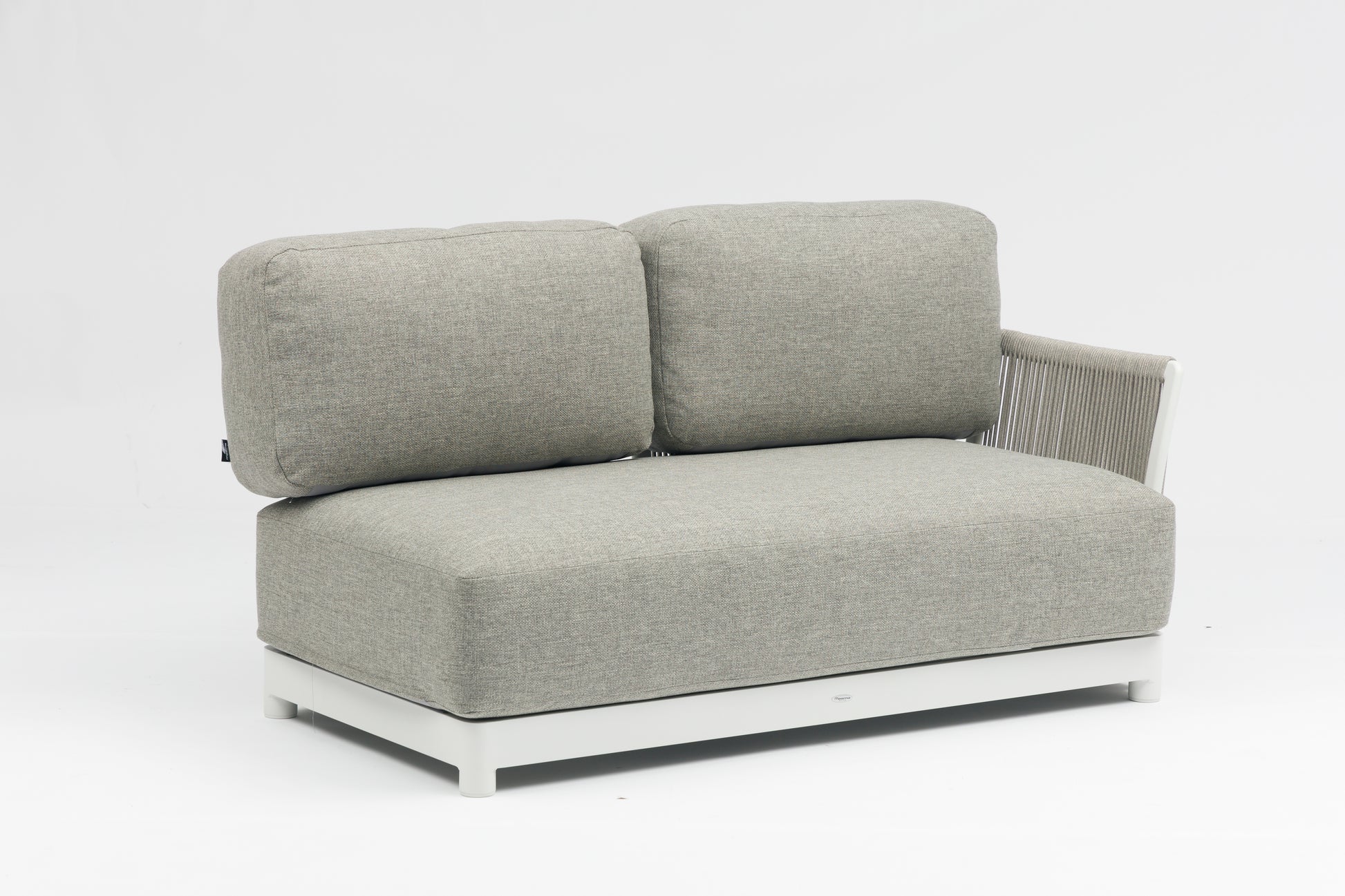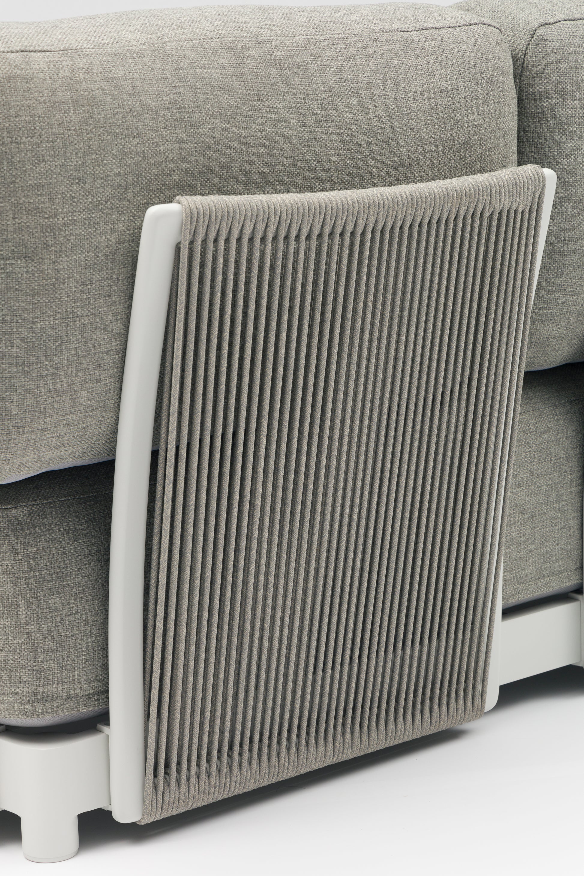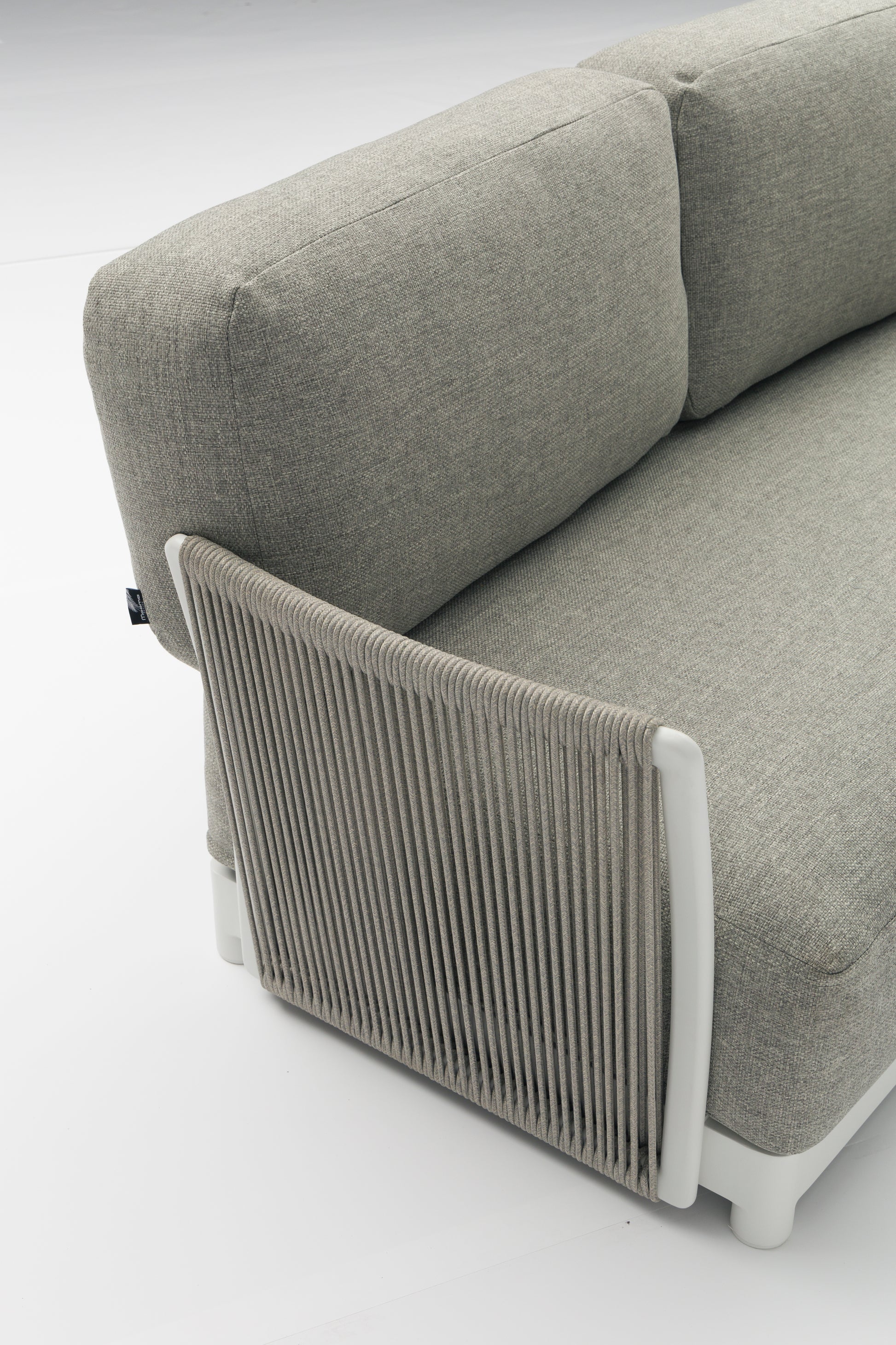 Sofá 2 plazas Silai. Estructura en aluminio blanco combinado con cuerda náutica de 8 mm color gris medio. Cojín de asiento (30 cm) y respaldo (15 cm) color gris medio. Sistema modular Requiere montaje.