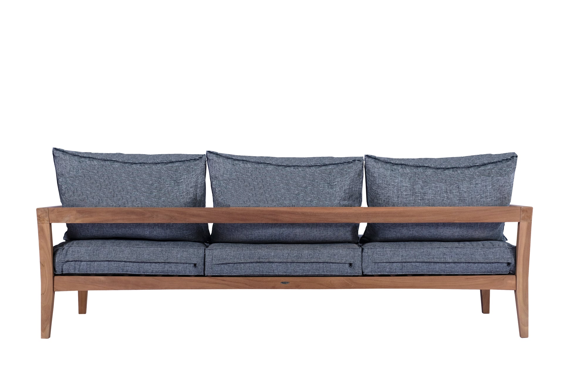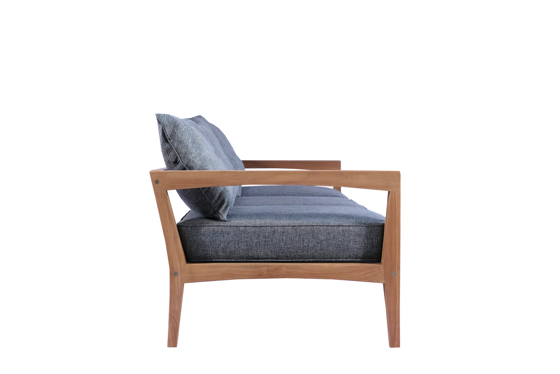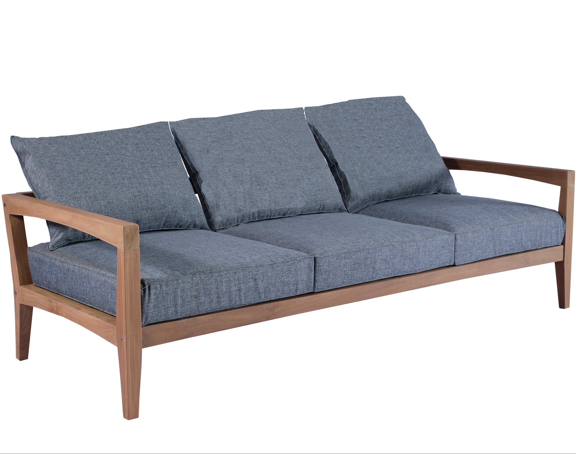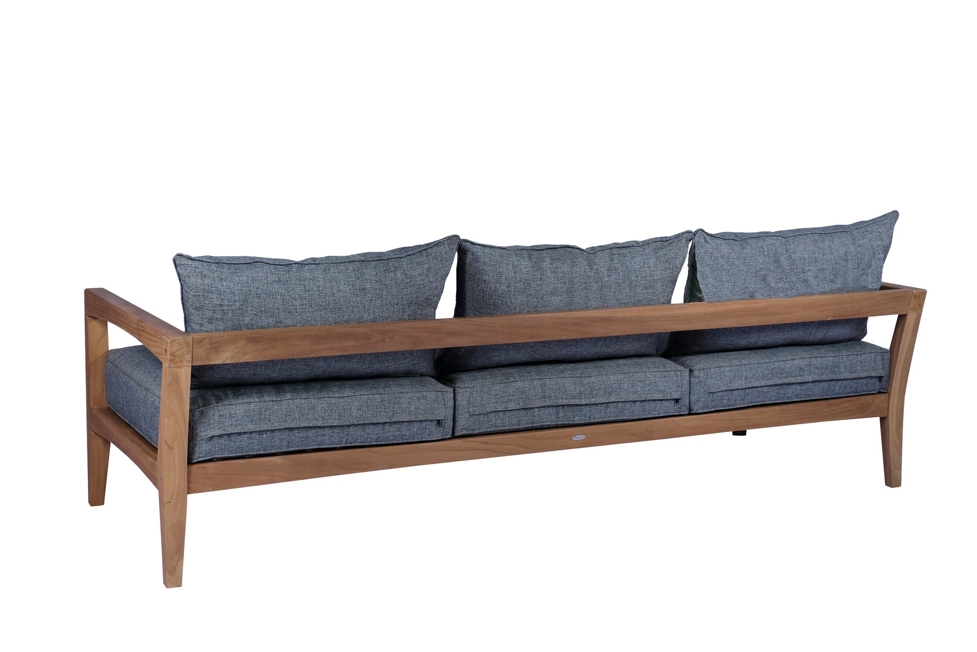 Sofá 3 plazas Roxas. Estructura en madera de teca de primera calidad cojinería de asiento (14 cm) y respaldo (17 cm) gris oscuro. Fácil montaje Tapicería gris claro opcional: 100803003 (x3).
