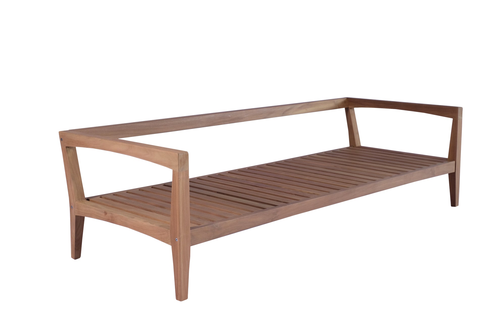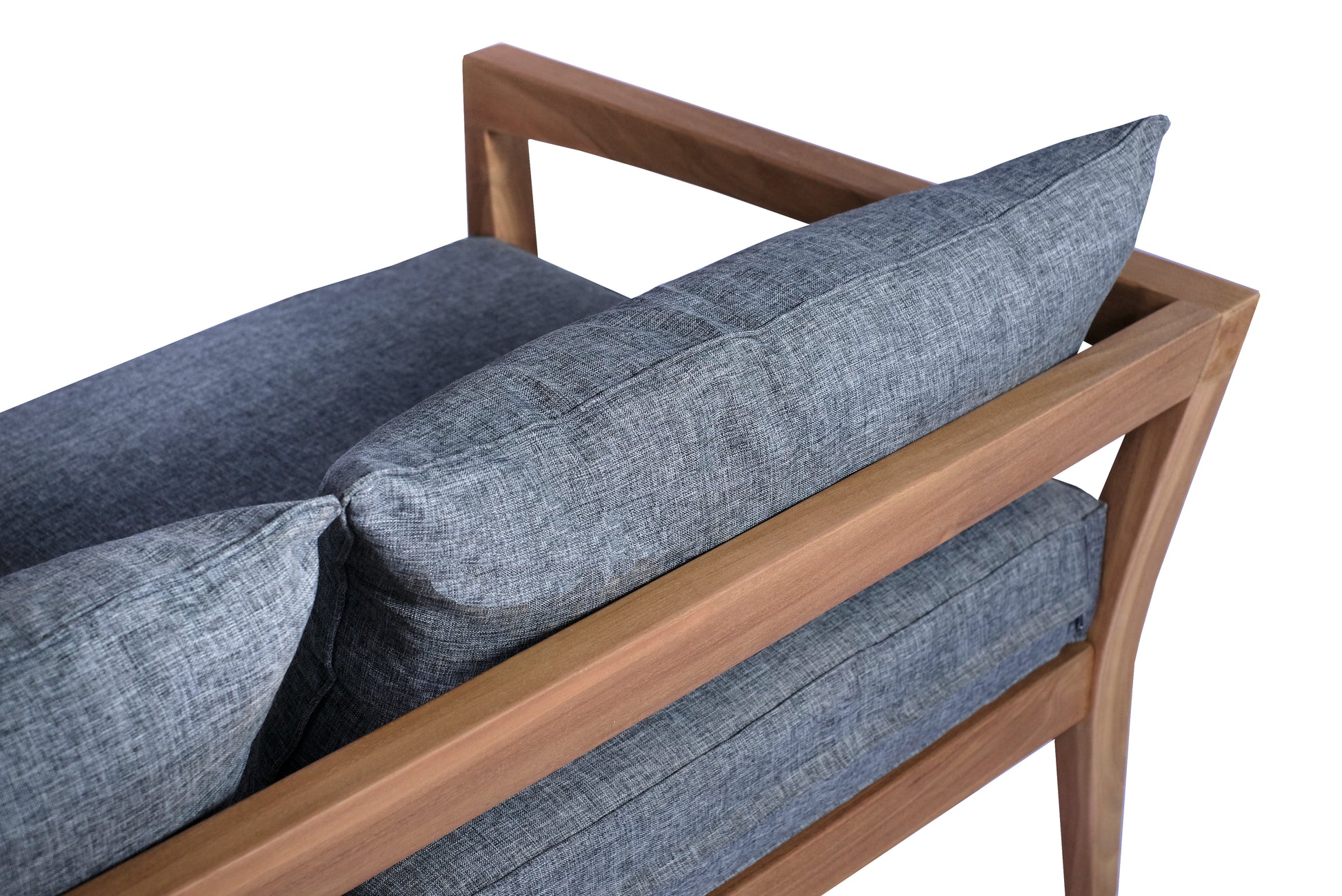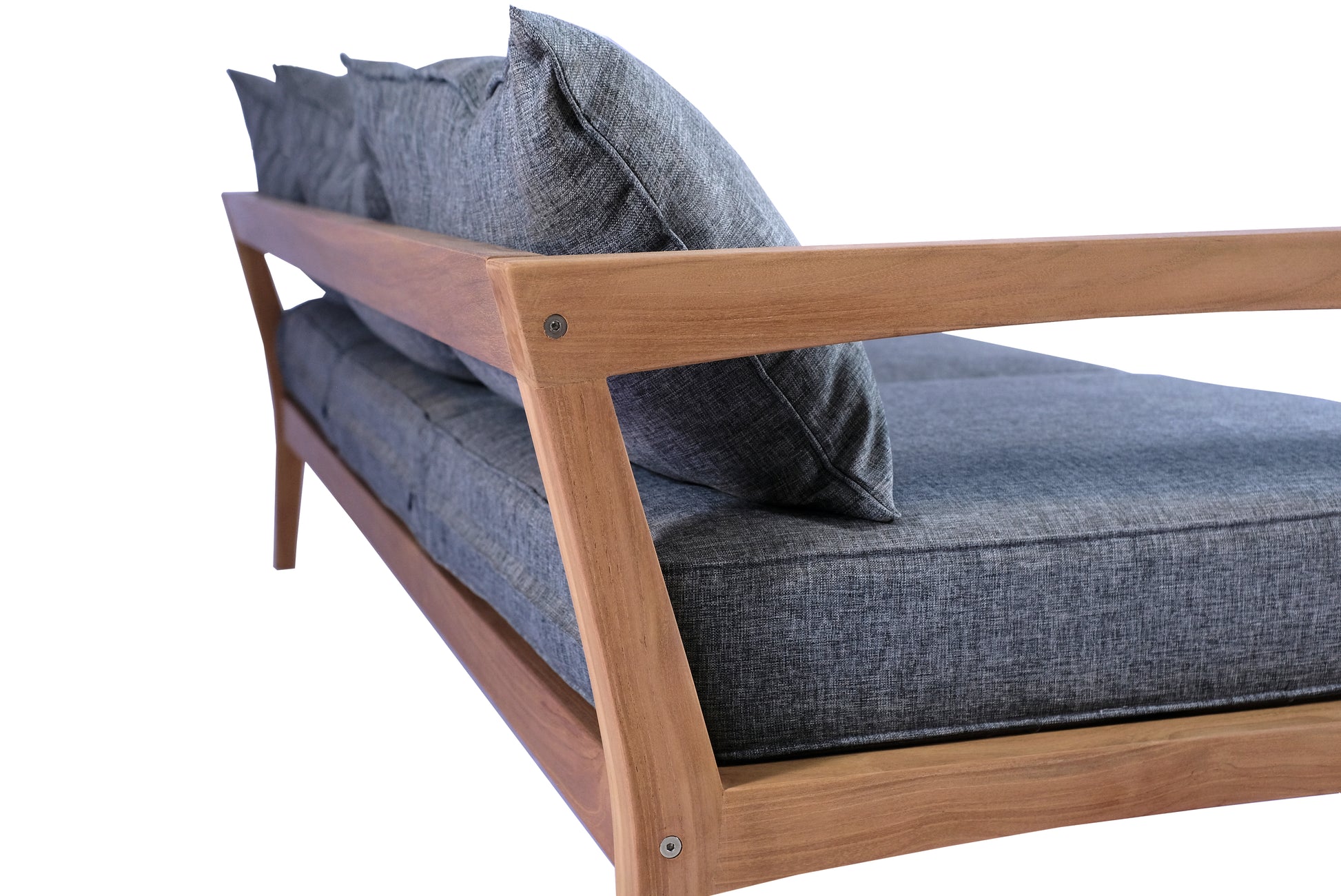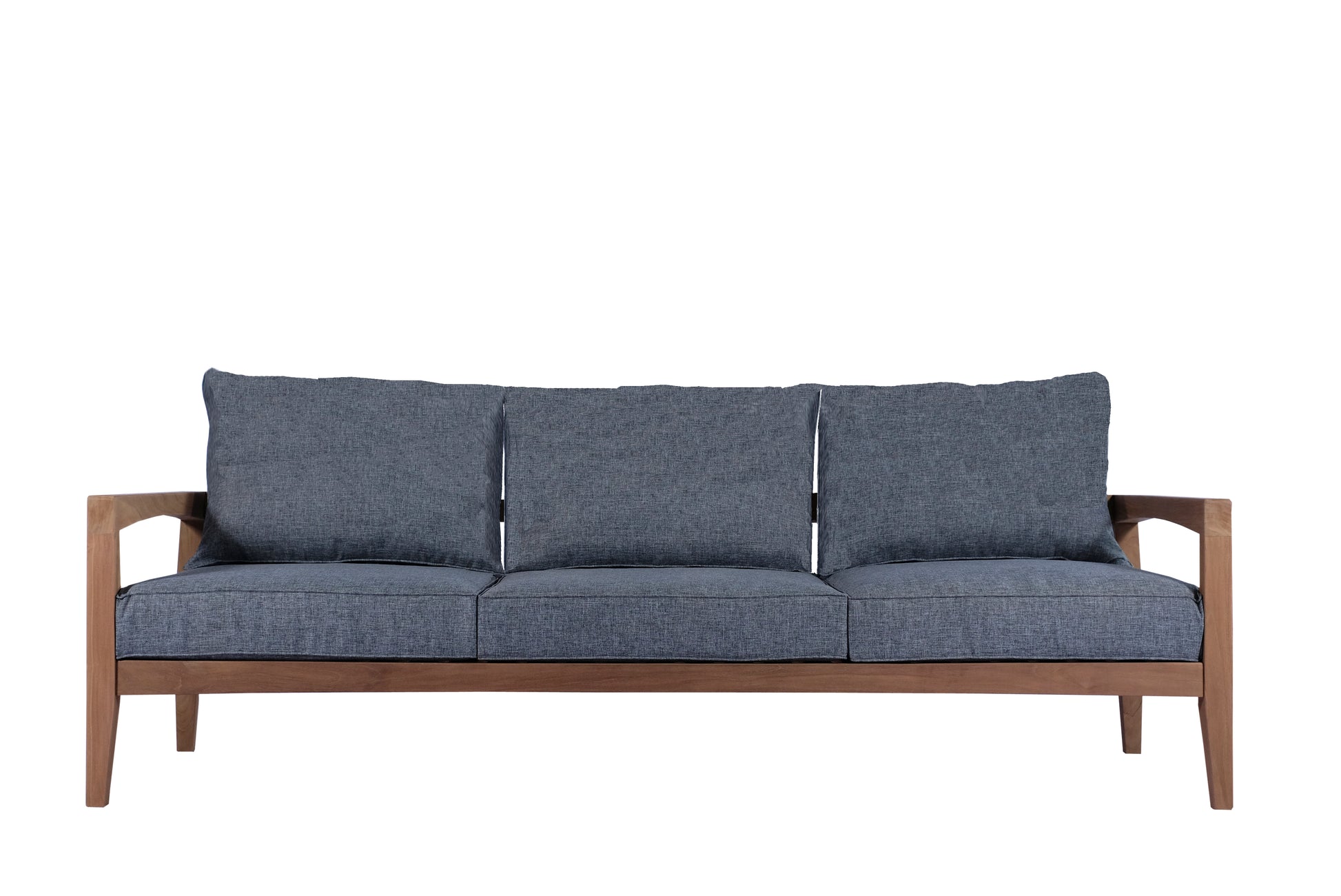 Sofá 3 plazas Roxas. Estructura en madera de teca de primera calidad cojinería de asiento (14 cm) y respaldo (17 cm) gris oscuro. Fácil montaje Tapicería gris claro opcional: 100803003 (x3).