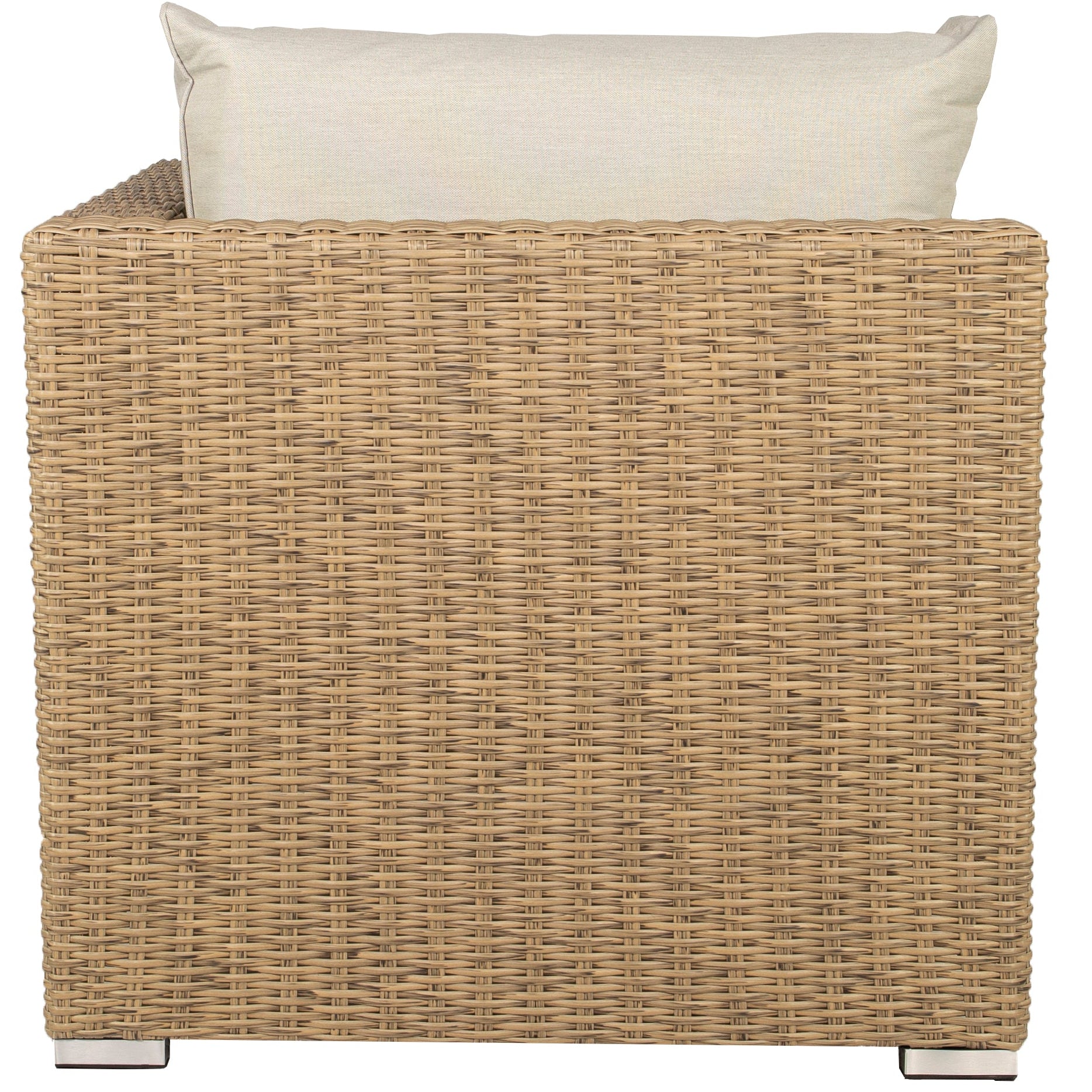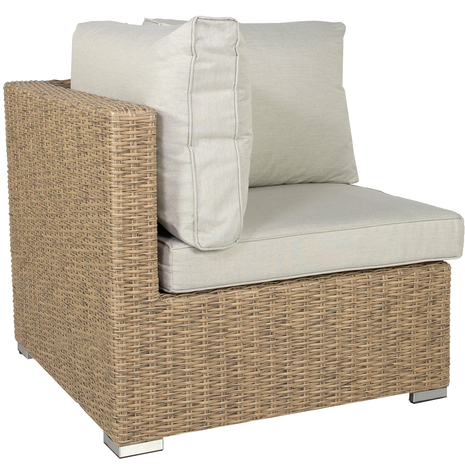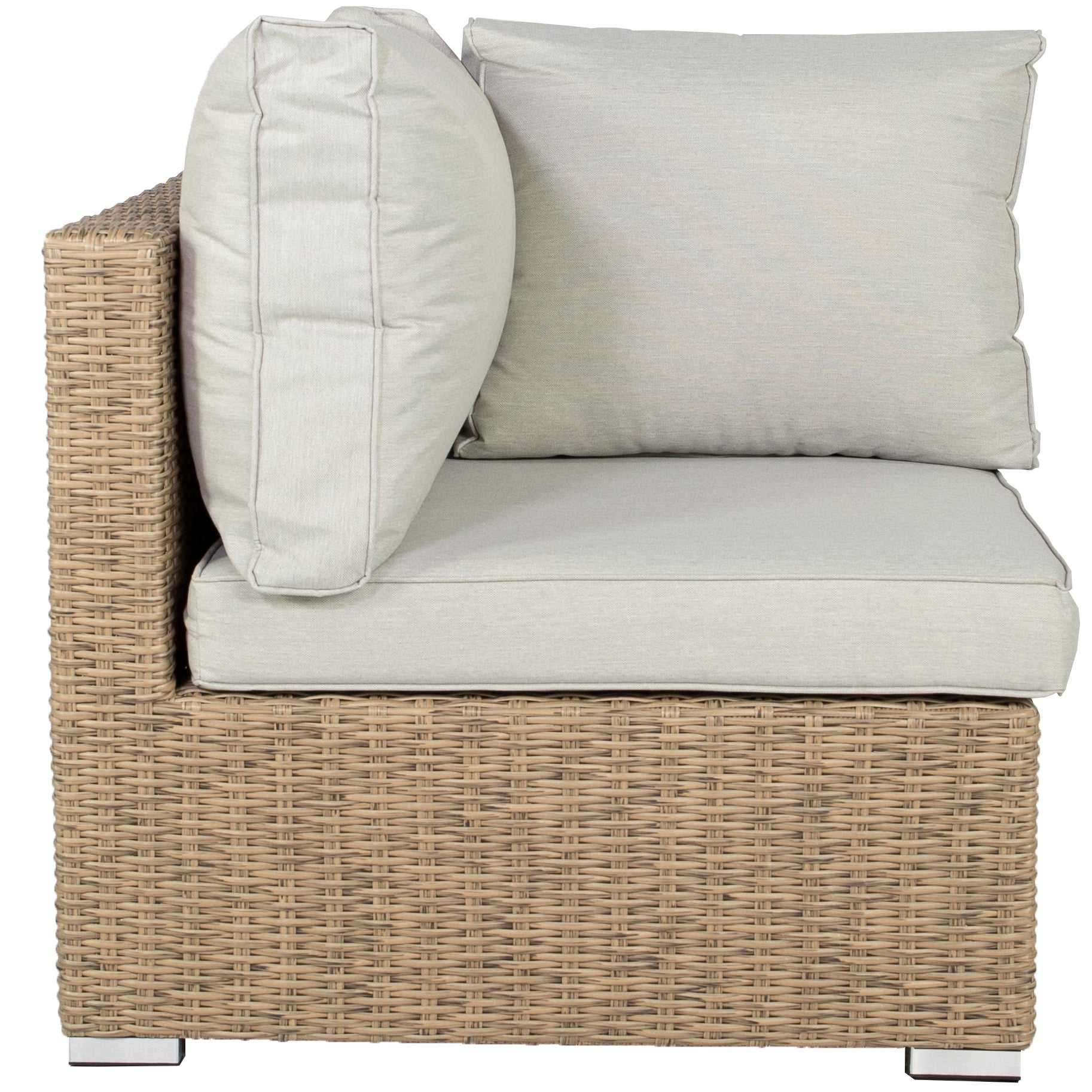 Sofá esquinero California. Estructura en aluminio lacado y ratán sintético halfround diam. 5 mm efecto nature con cojín de asiento (12 cm) y respaldo (20 cm) color gris medio..