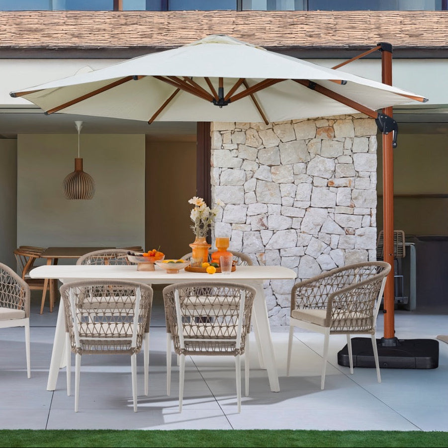 Sombrilla Igris octogonal Ø 350 cm pie lateral y base rellenable de 150 kg. Estructura en aluminio recubierto por transferencia térmica efecto teca natural. Mástil 60x100mm. Cubierta color crudo 220g. Sistema de rotación 360º. Base con ruedas extraibles y funda protectora incluida.