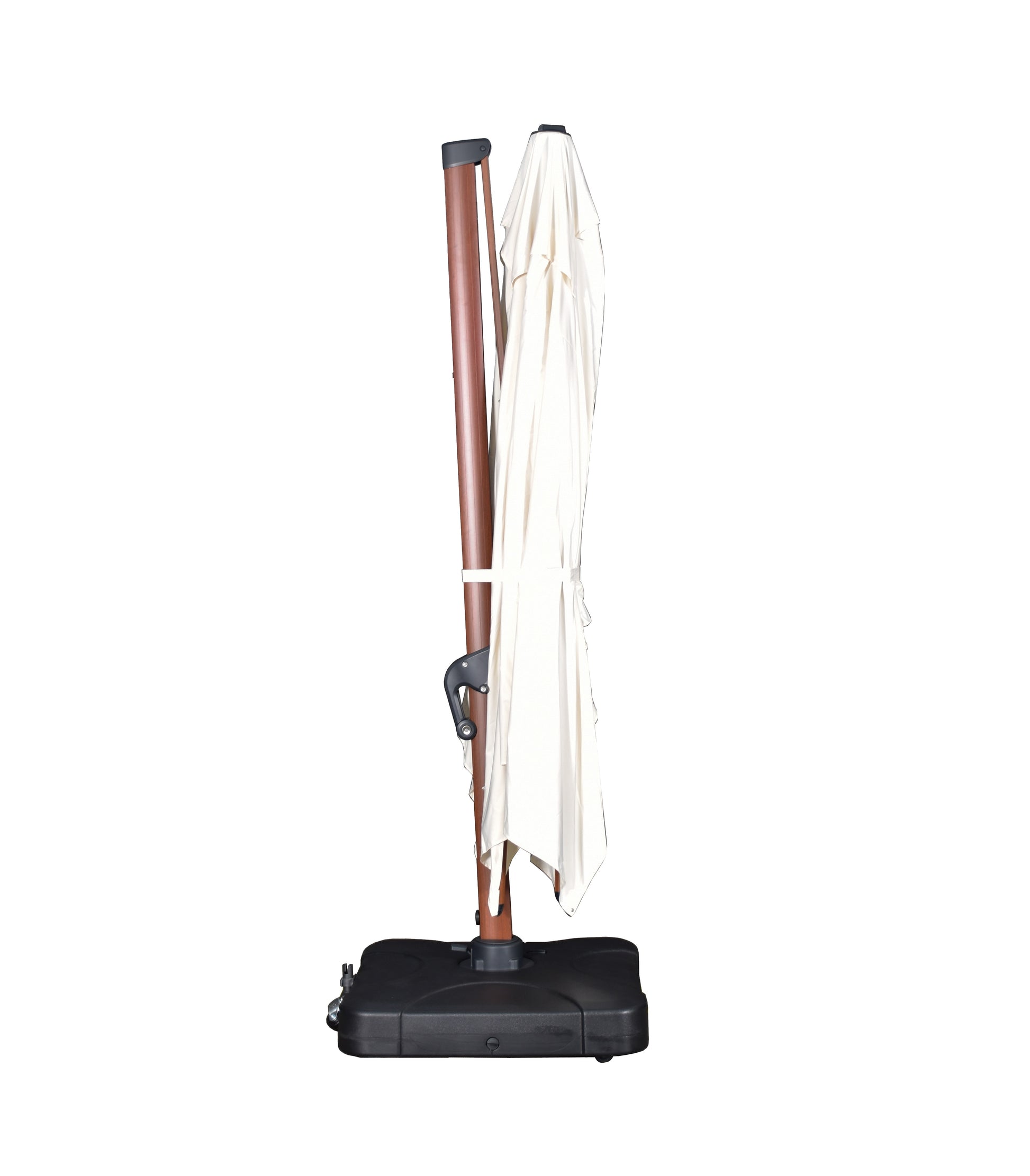 Sombrilla Igris rectangular 300x400 cm con pie lateral y base rellenable de 150 kg. Estructura en aluminio recubierto por transferencia térmica efecto teca natural mástil 60x100mm. Cubierta color crudo 220g. Sistema de rotación 360º Base con ruedas extraíbles y funda protectora incluida..