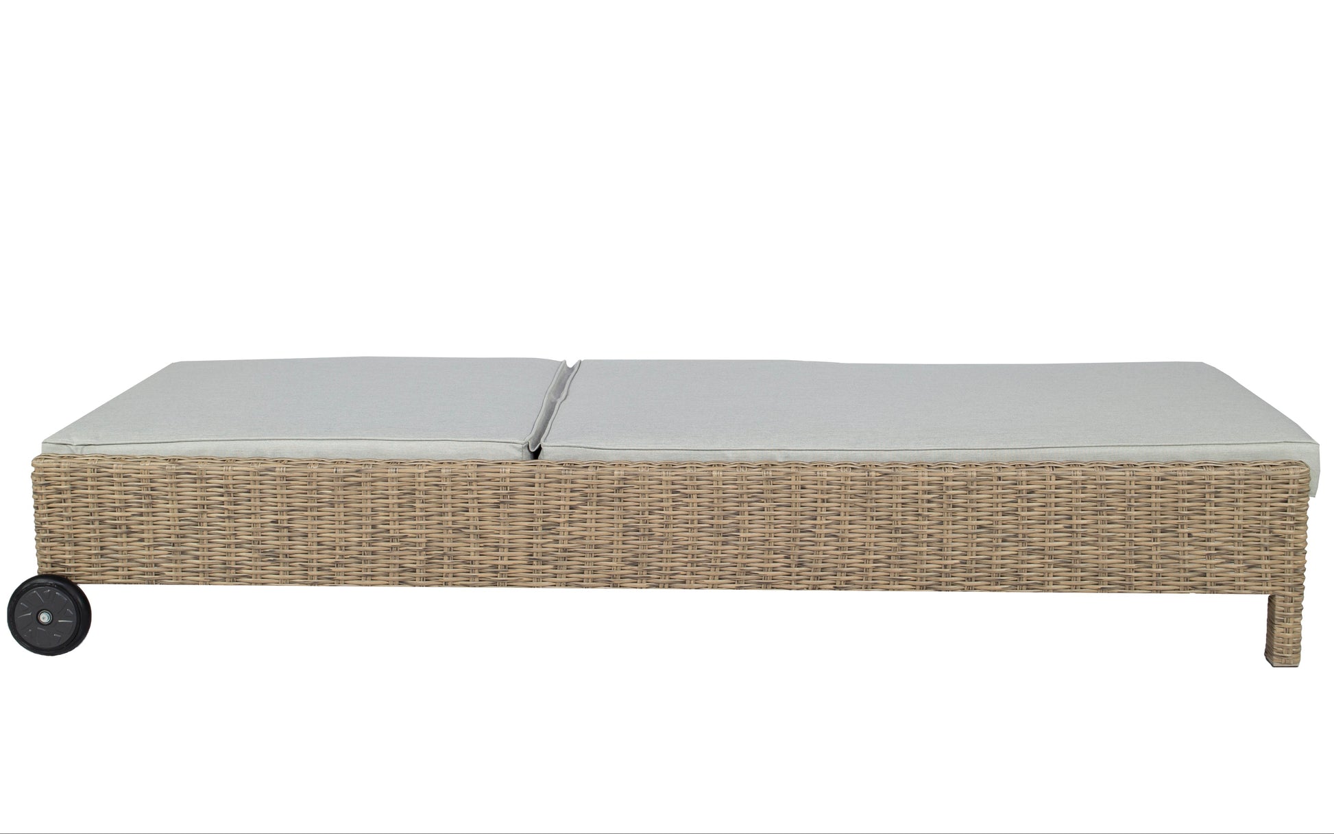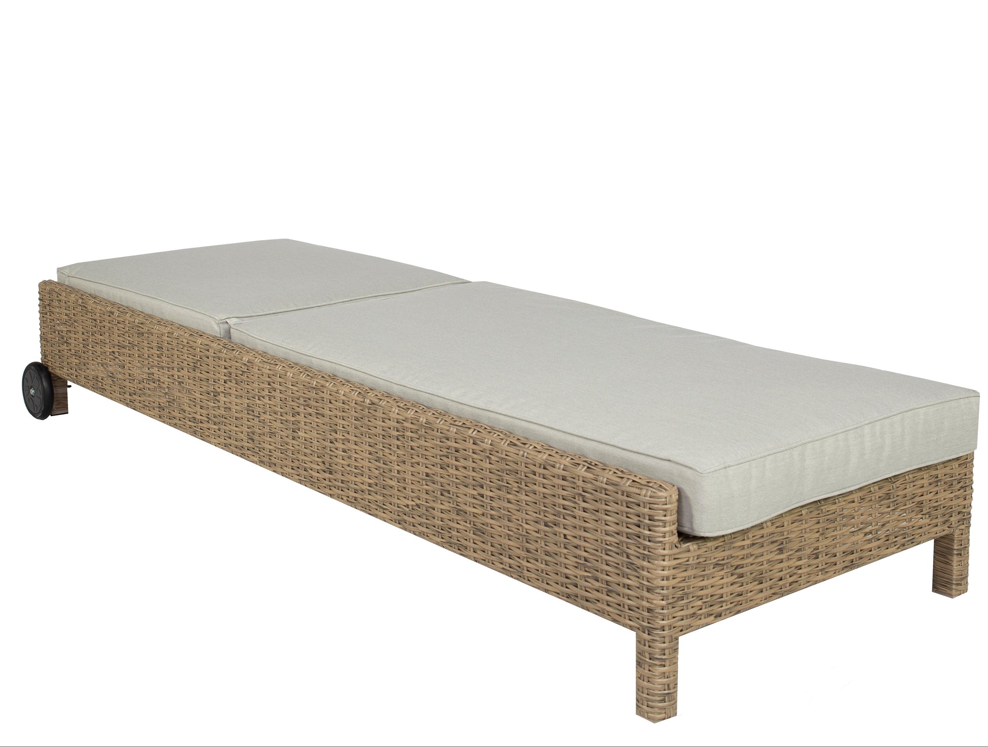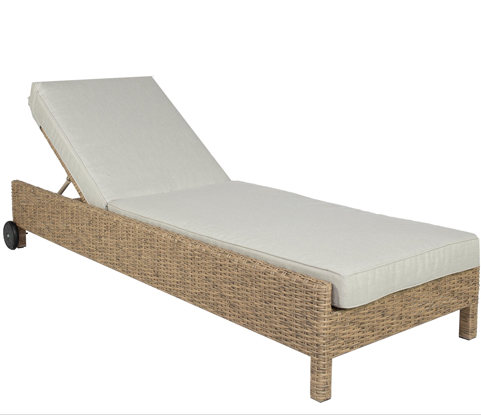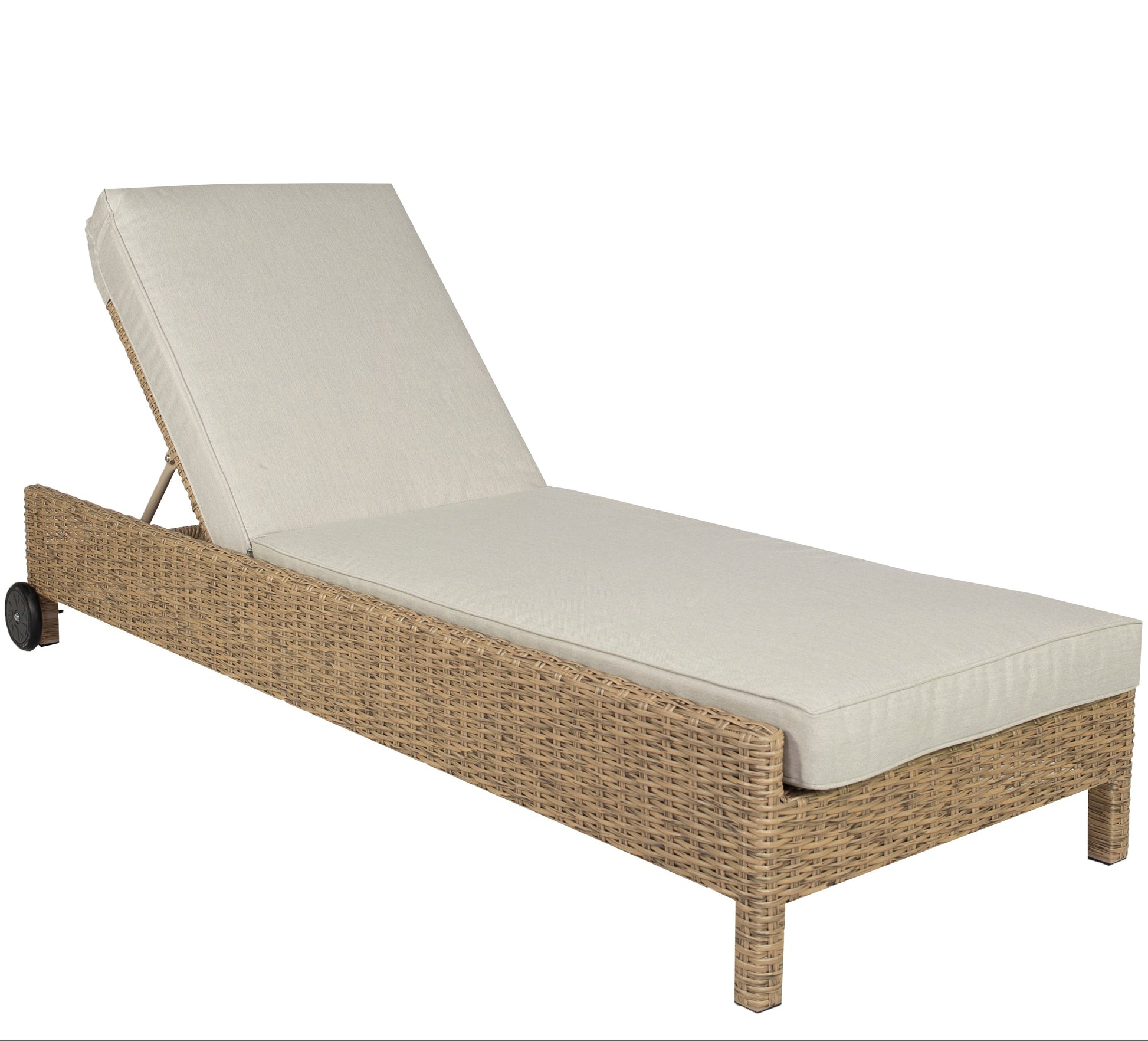 Tumbona California. Estructura en aluminio lacado y ratán sintético halfround diam. 5 mm efecto nature con cojín de 10 cm. Respaldo multiposición y ruedas de transporte..