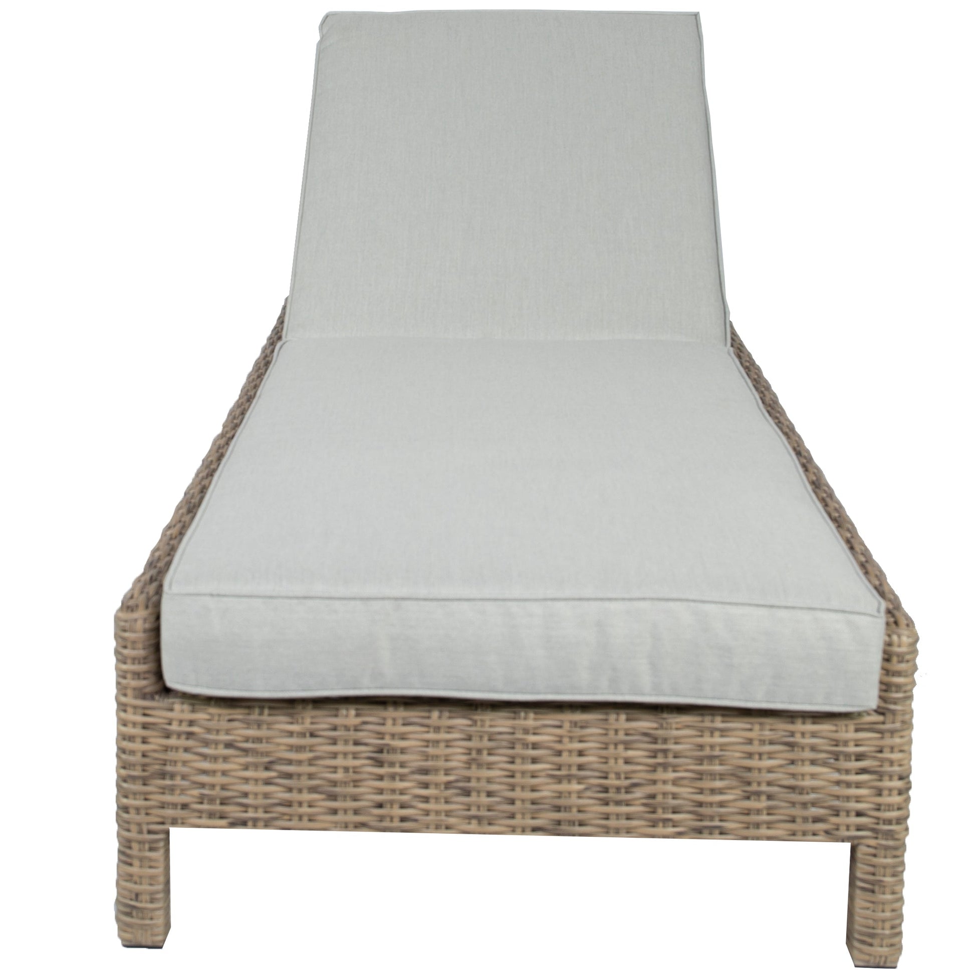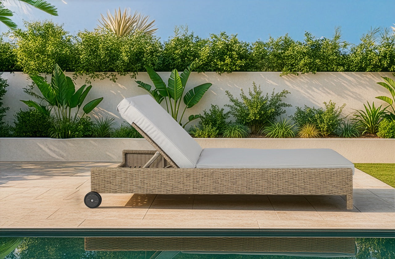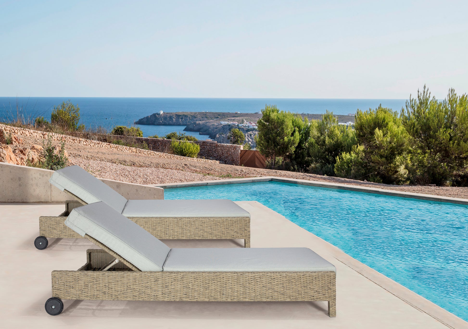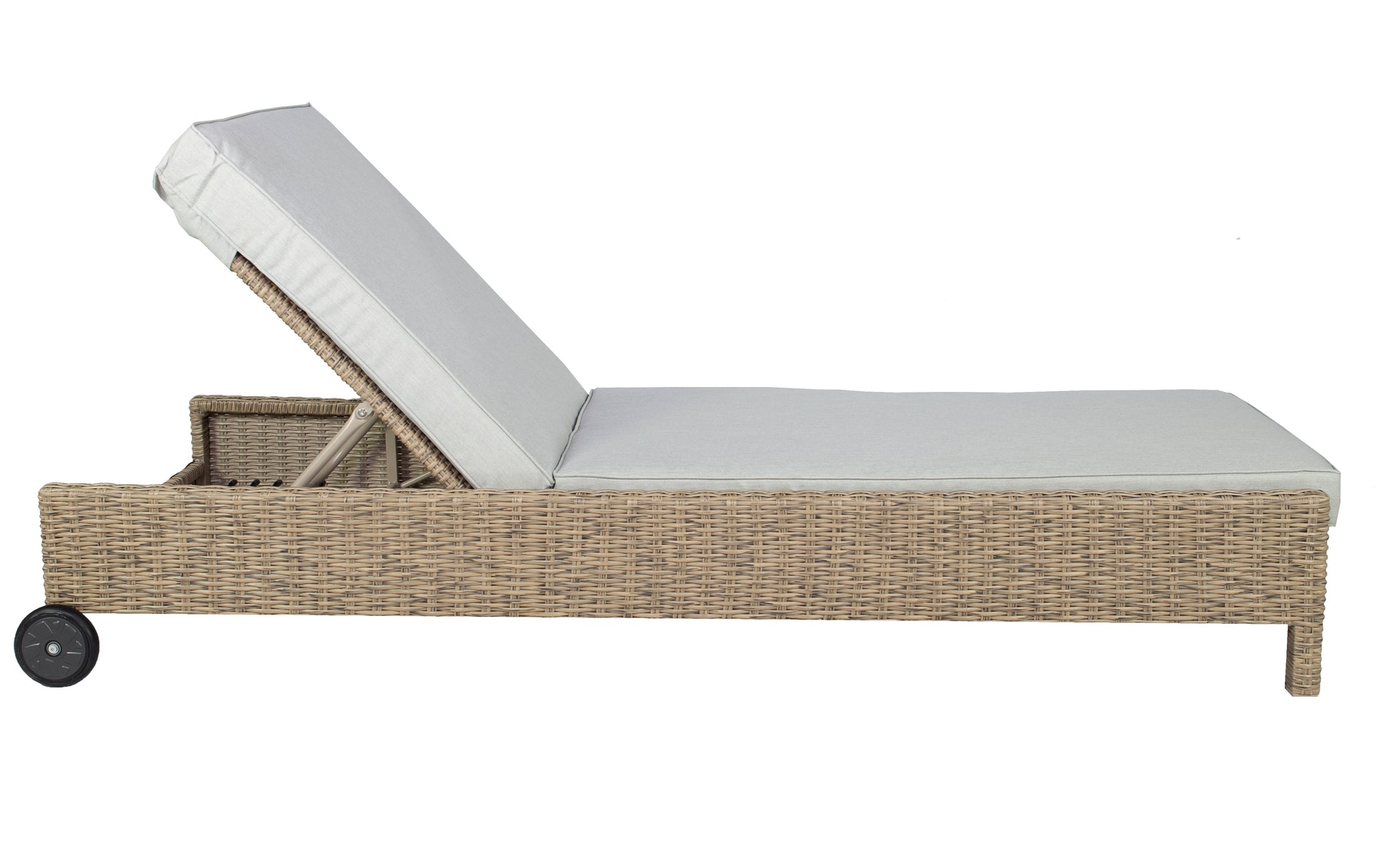 Tumbona California. Estructura en aluminio lacado y ratán sintético halfround diam. 5 mm efecto nature con cojín de 10 cm. Respaldo multiposición y ruedas de transporte..