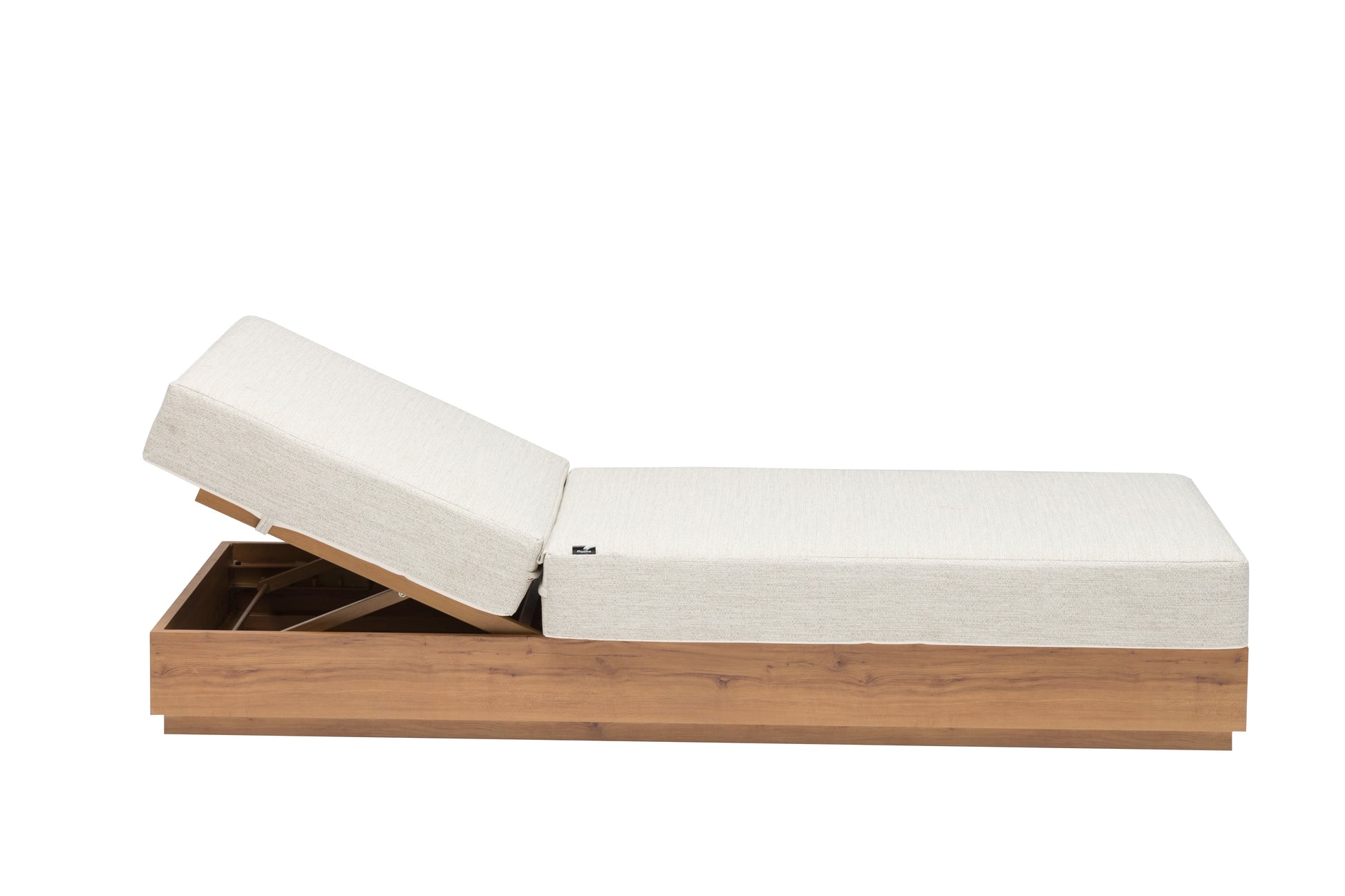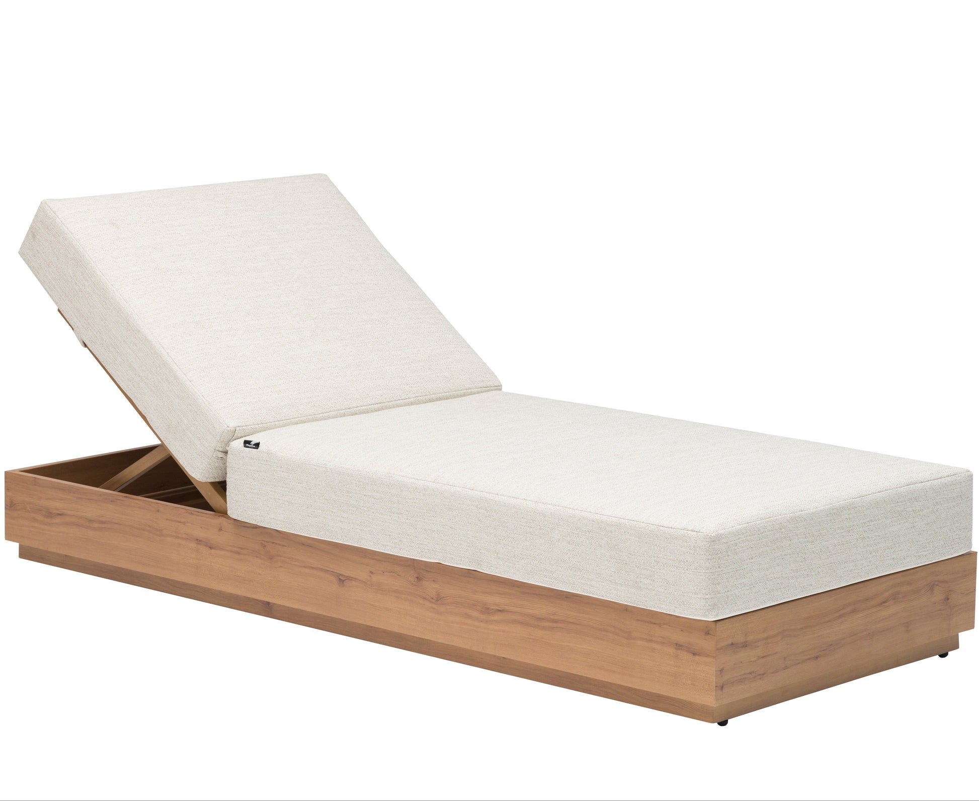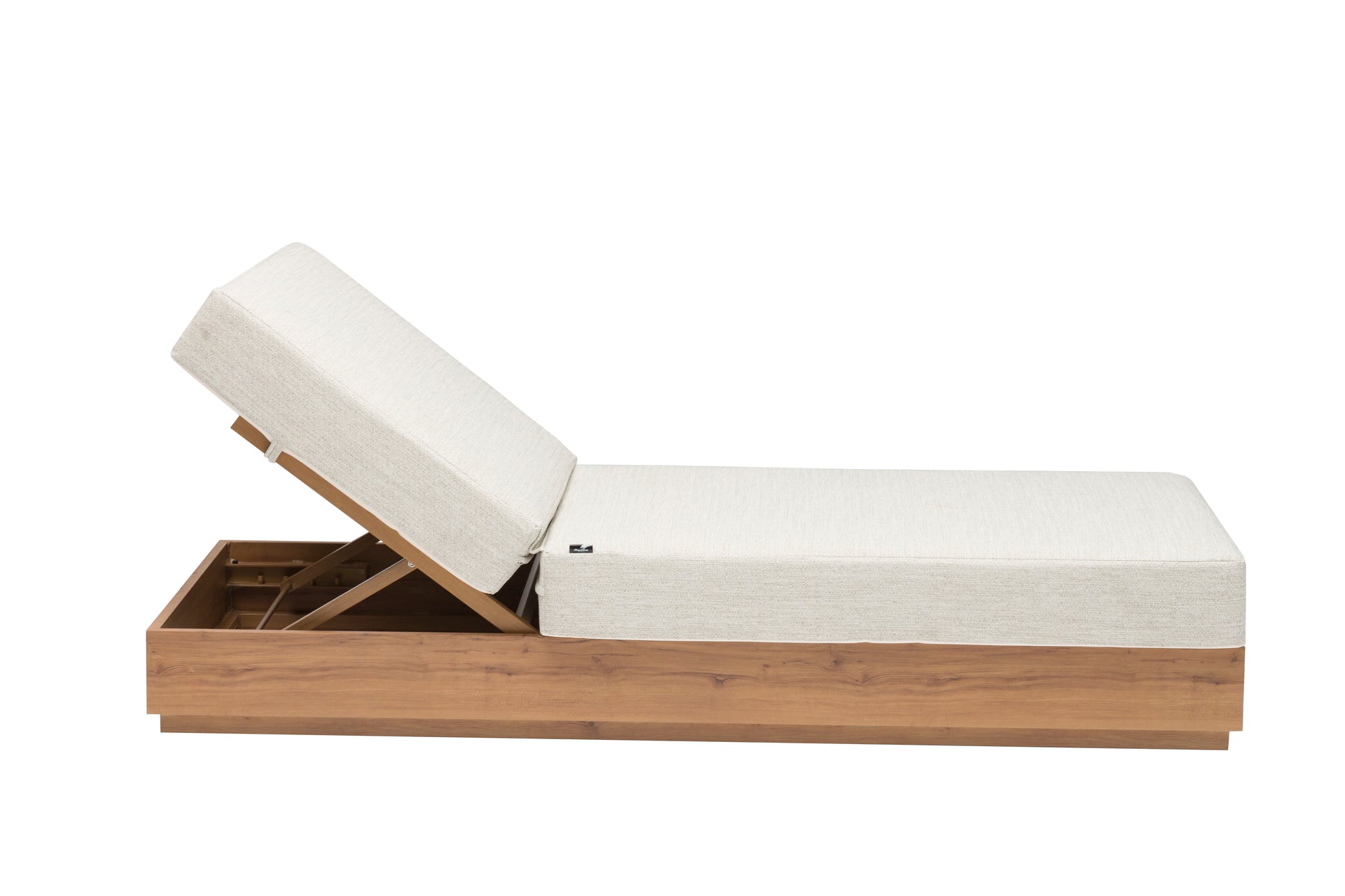 Tumbona Java 190x80x36 cm. Estructura en aluminio recubierto por transferencia térmica efecto teca natural de alta durabilidad. Colchón (16 cm) en tejido in & out beige. Con ruedas de transporte y respaldo multiposición..