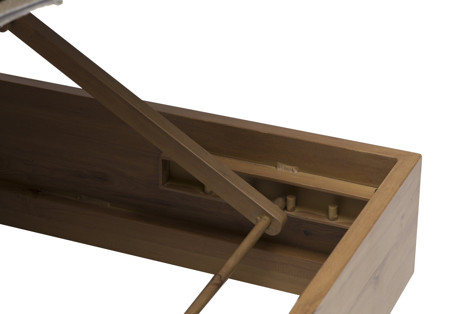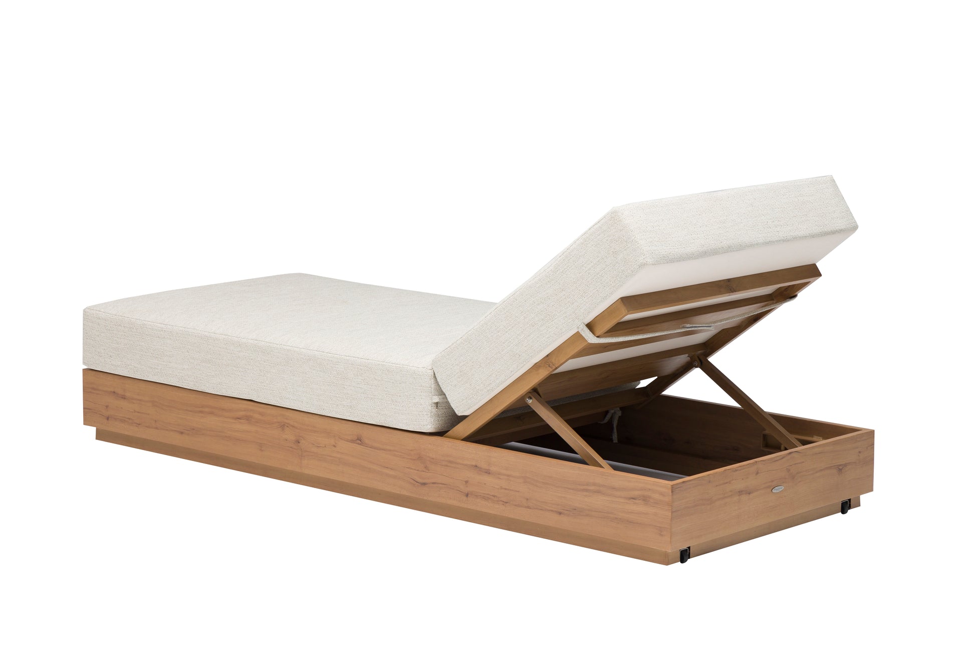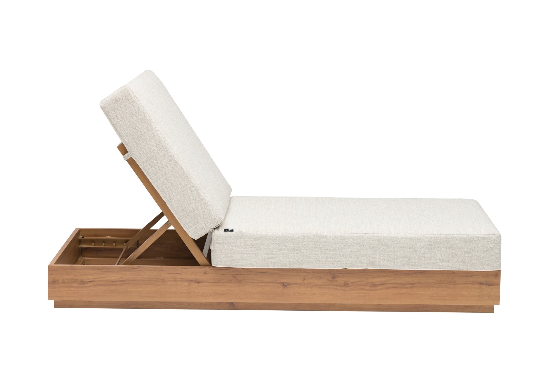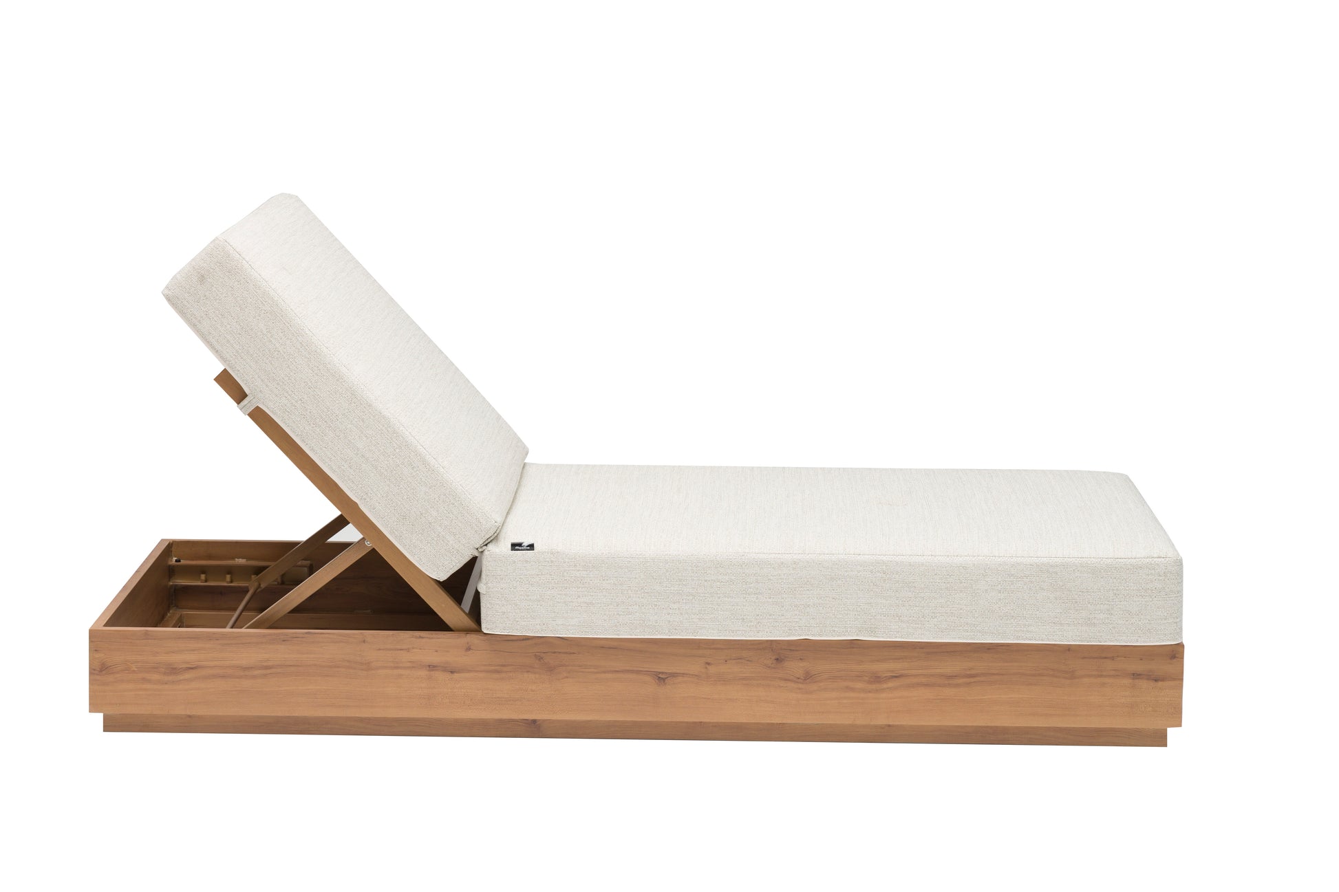 Tumbona Java 190x80x36 cm. Estructura en aluminio recubierto por transferencia térmica efecto teca natural de alta durabilidad. Colchón (16 cm) en tejido in & out beige. Con ruedas de transporte y respaldo multiposición..