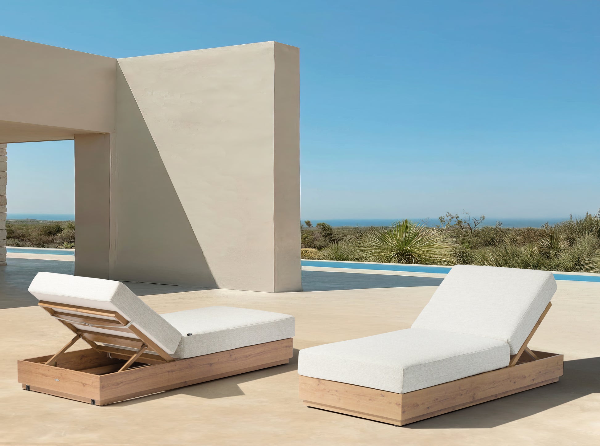 Cada estructura refuerza sus puntos de carga con tornillería y apliques de primera calidad y listones sobredimensionados. Incorporamos materiales premium como Textilene Batyline, tapicerías waterproof, espumas de alta densidad y encimeras de cristal templado. Todo diseñado para lograr un mueble resistente, cómodo y funcional en cualquier espacio exterior.